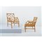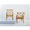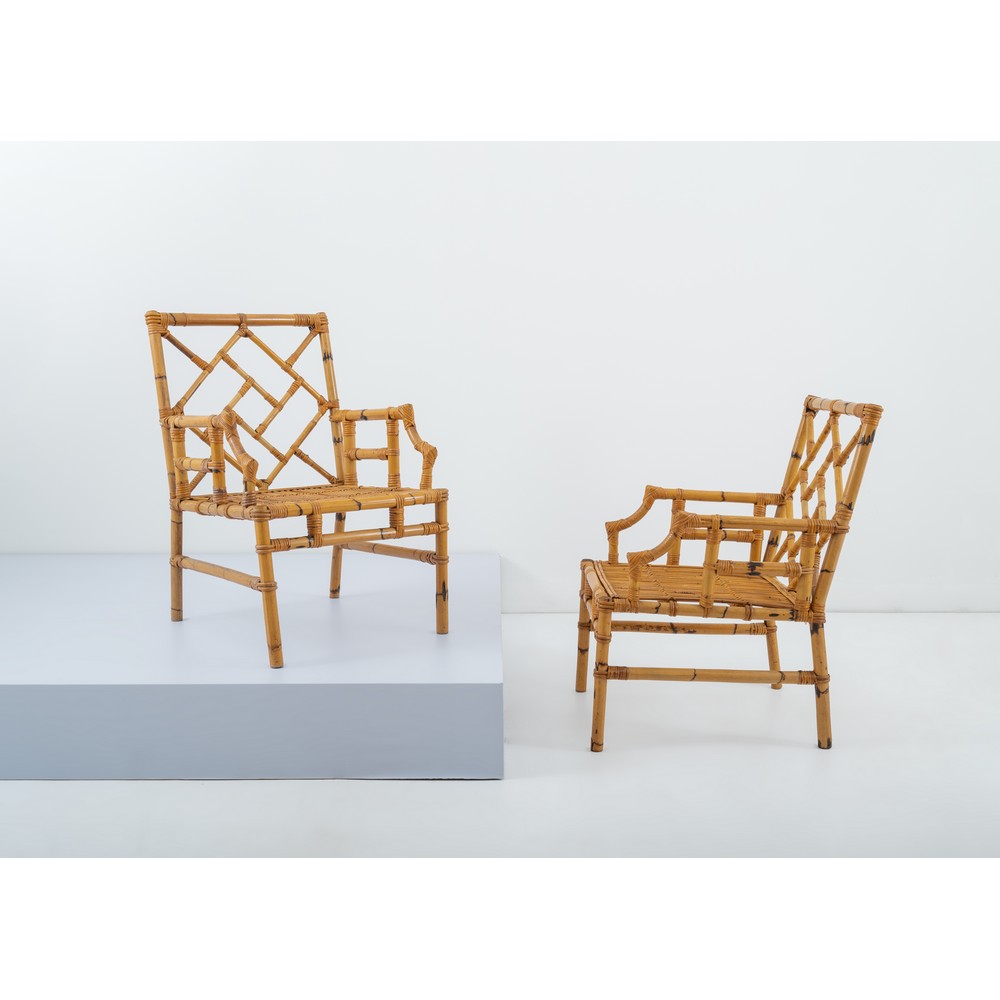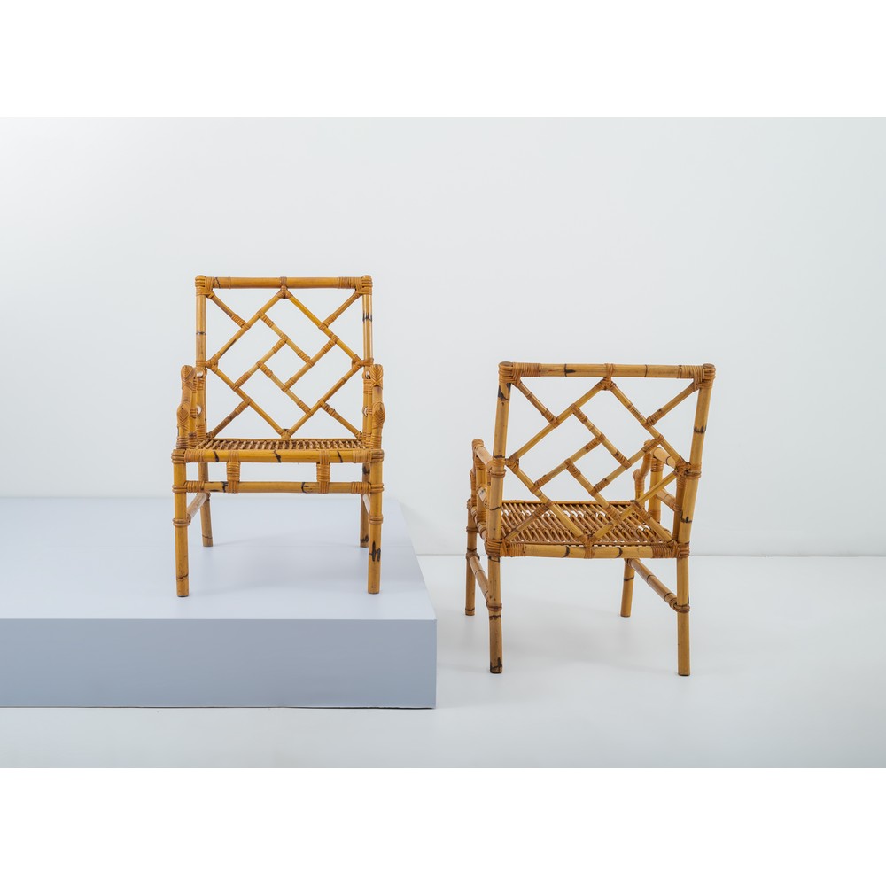 Coppia di poltrone con struttura in bamboo, schienale a decoro geometrico, poggioli curvati.