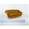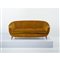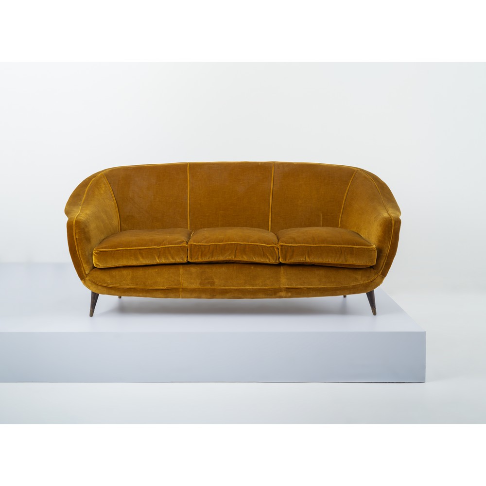 Divano a tre posti con struttura in legno, imbottitura, rivestimento in velluto ocra, piedi conici in legno e ottone. Segni d’uso.