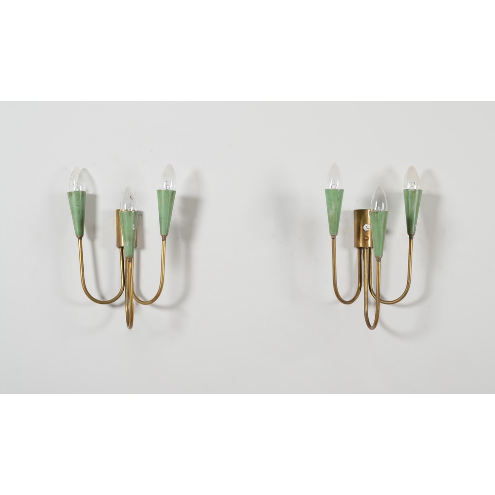 Coppia di lampade da parete a tre luci, struttura in tubolare di ottone, bracci ricurvati con diffusori conici in metallo verniciato verde.