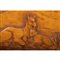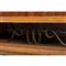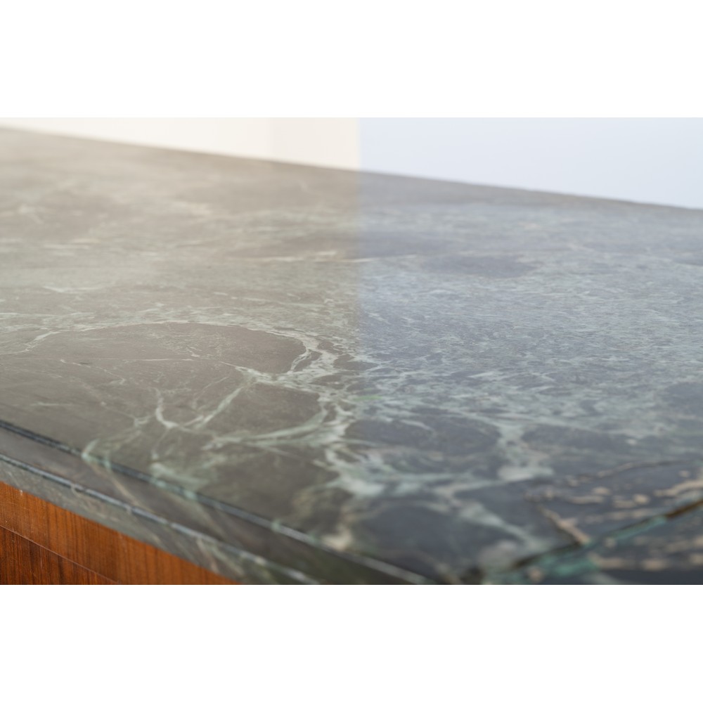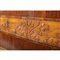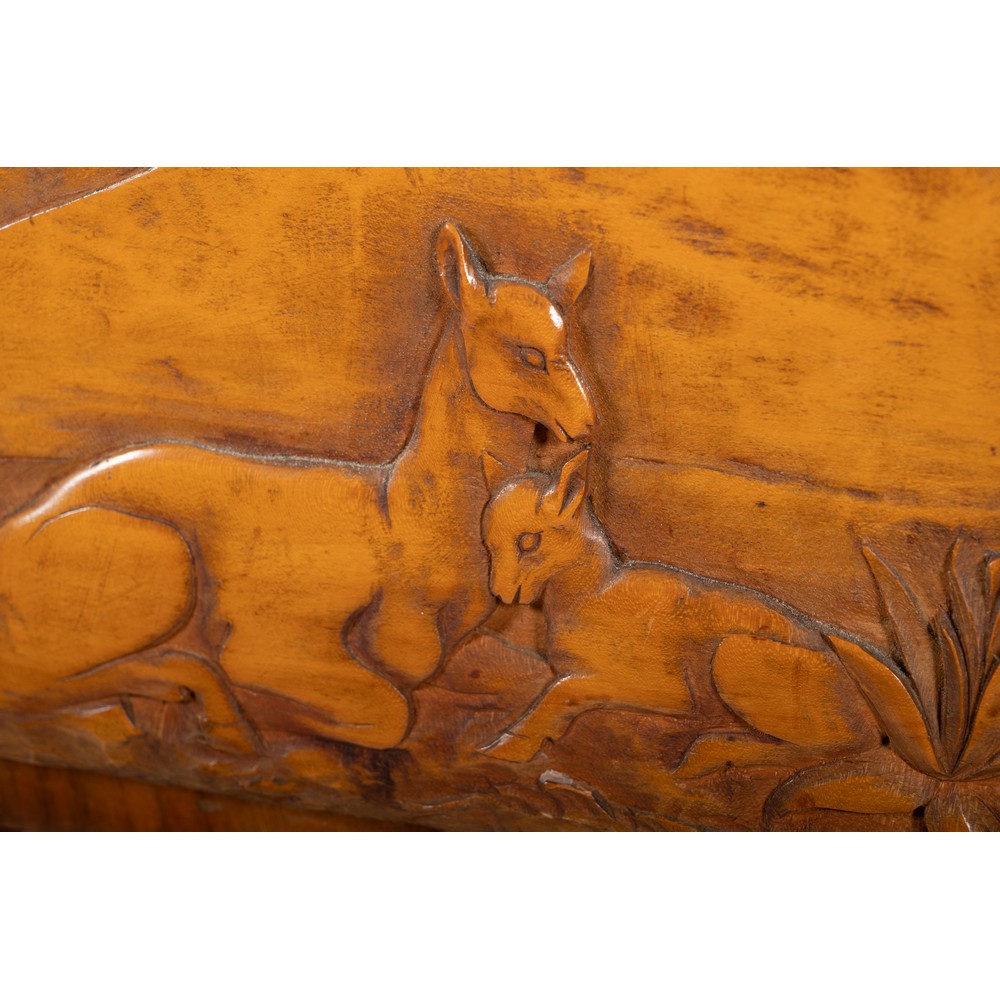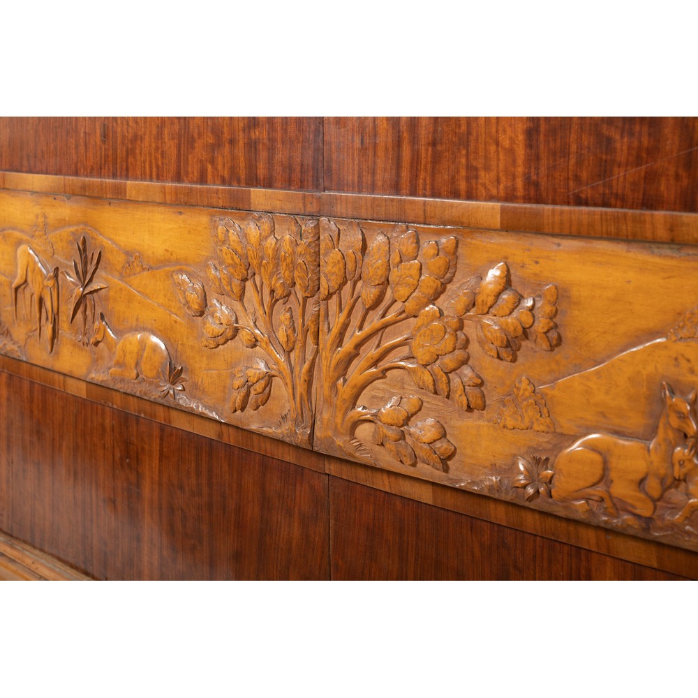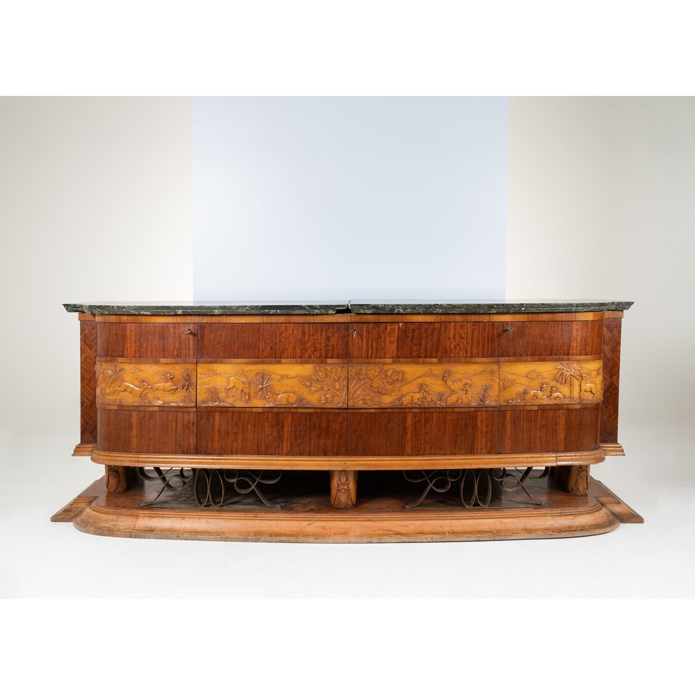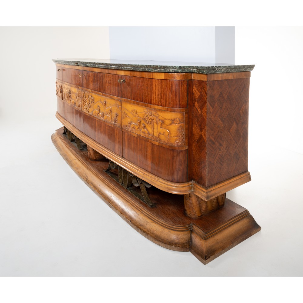 Grande sideboard in varie essenze di legno probabile lavoro su commissione, piano sagomato e rivestito con doppia lastra di marmo verde, corpo principale sospeso, sul fronte quattro sportelli a battente decorati con una fascia in acero scolpita a bassorilievo con animali esotici su paesaggio con palme e alberi, sui fianchi marquetterie a canestro. Tre piedi in legno scolpito con decori in ottone martellato, base sagomata. Il piano in marmo presenta una rottura centrale.