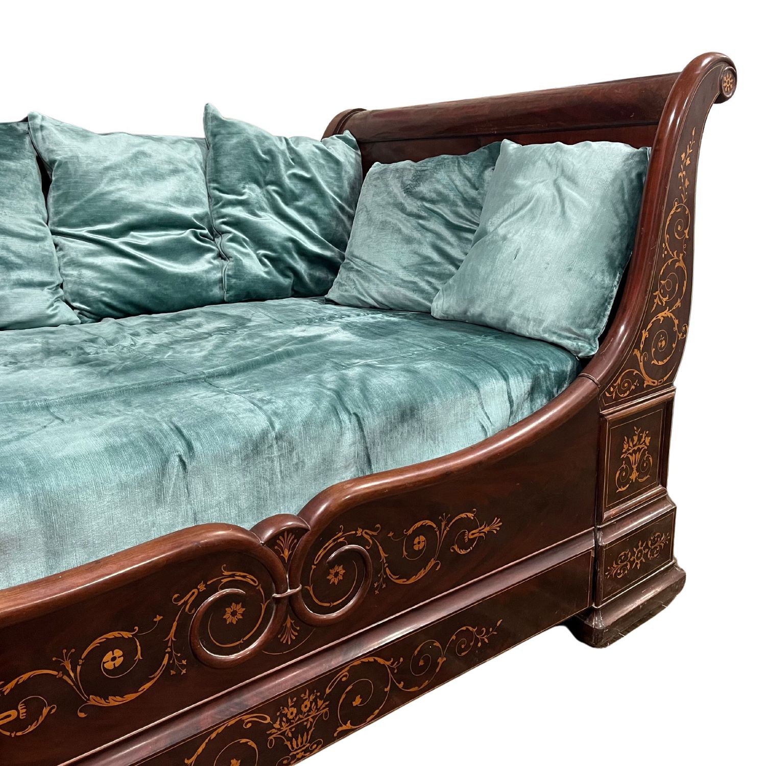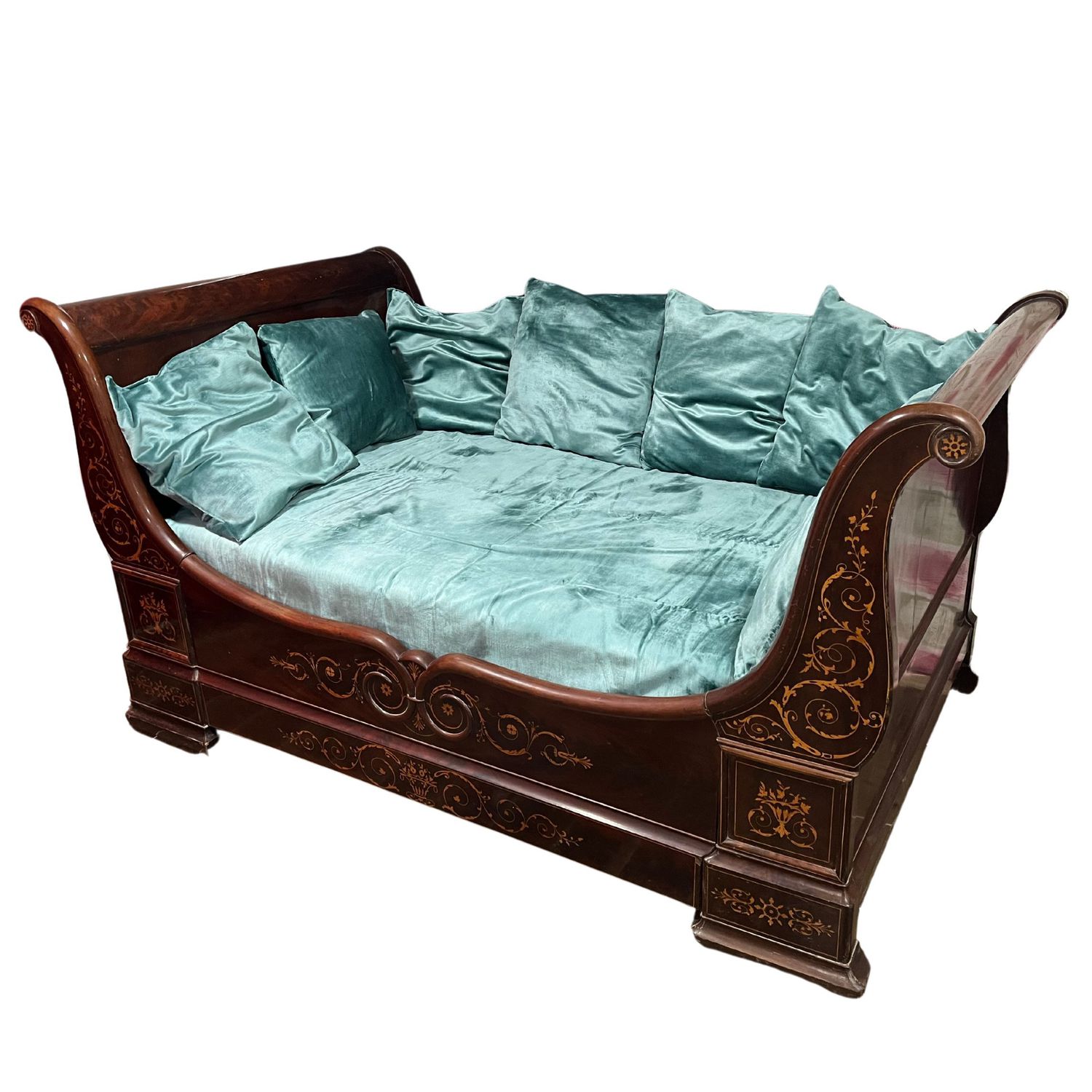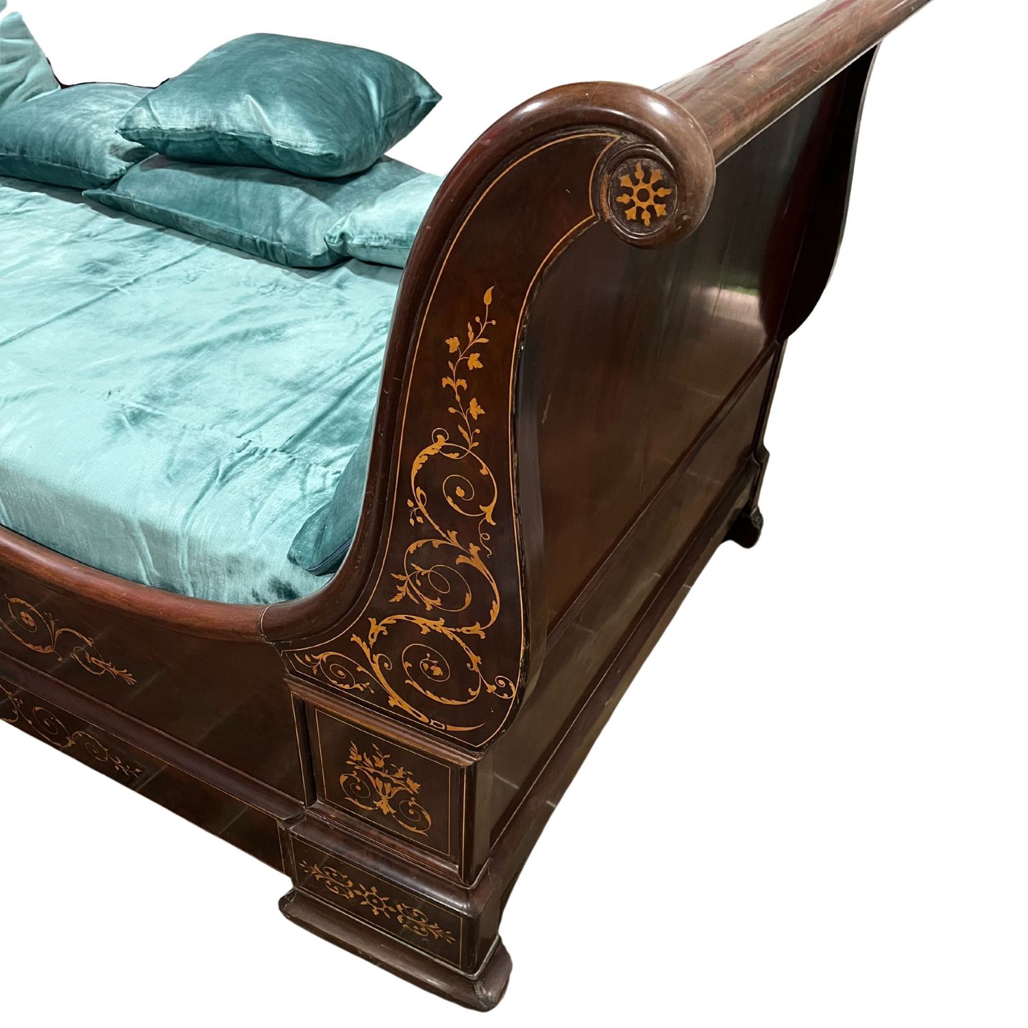 Importante Letto in legno di Mogano piumato e intarsi a motivo floreale periodo Carlo X Francia XIX secolo.
