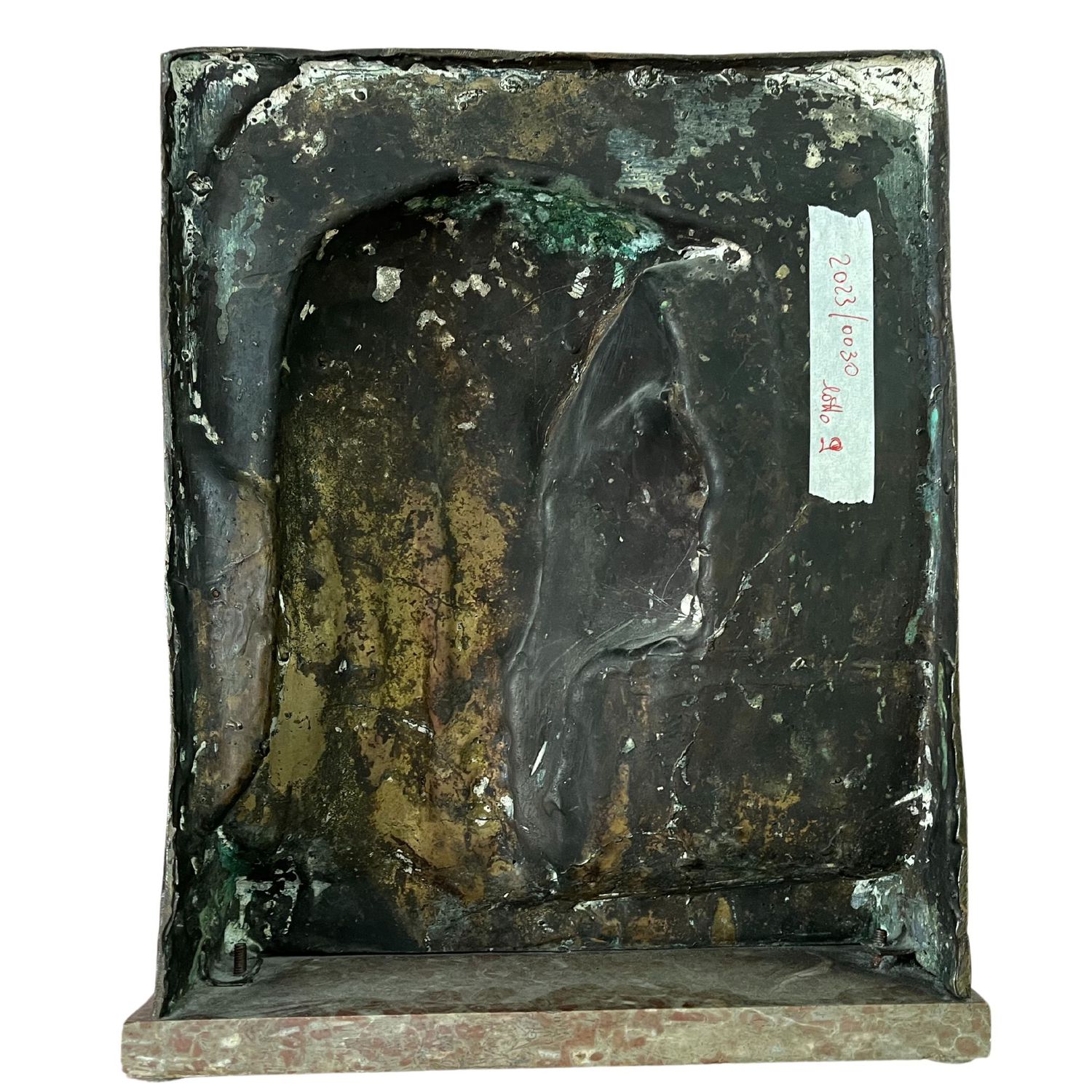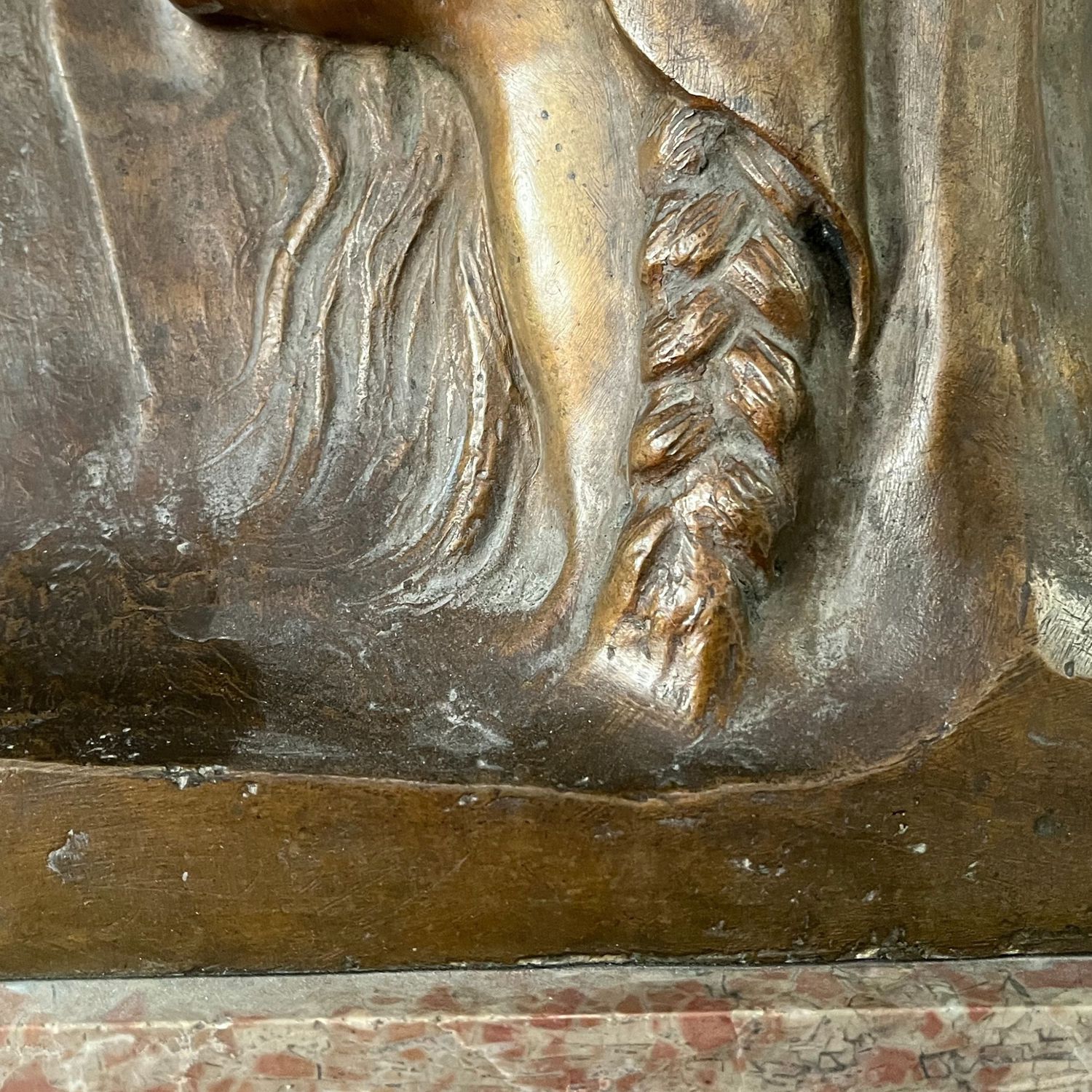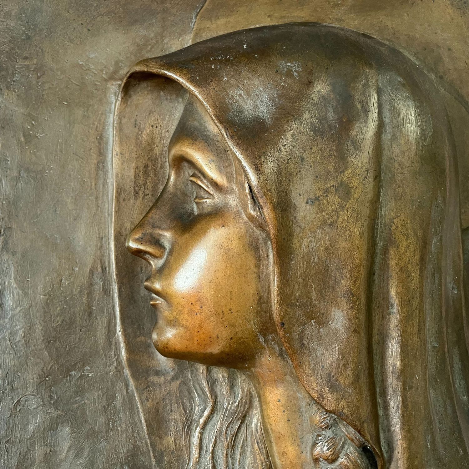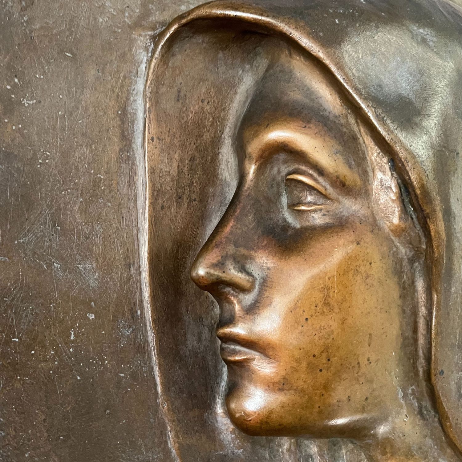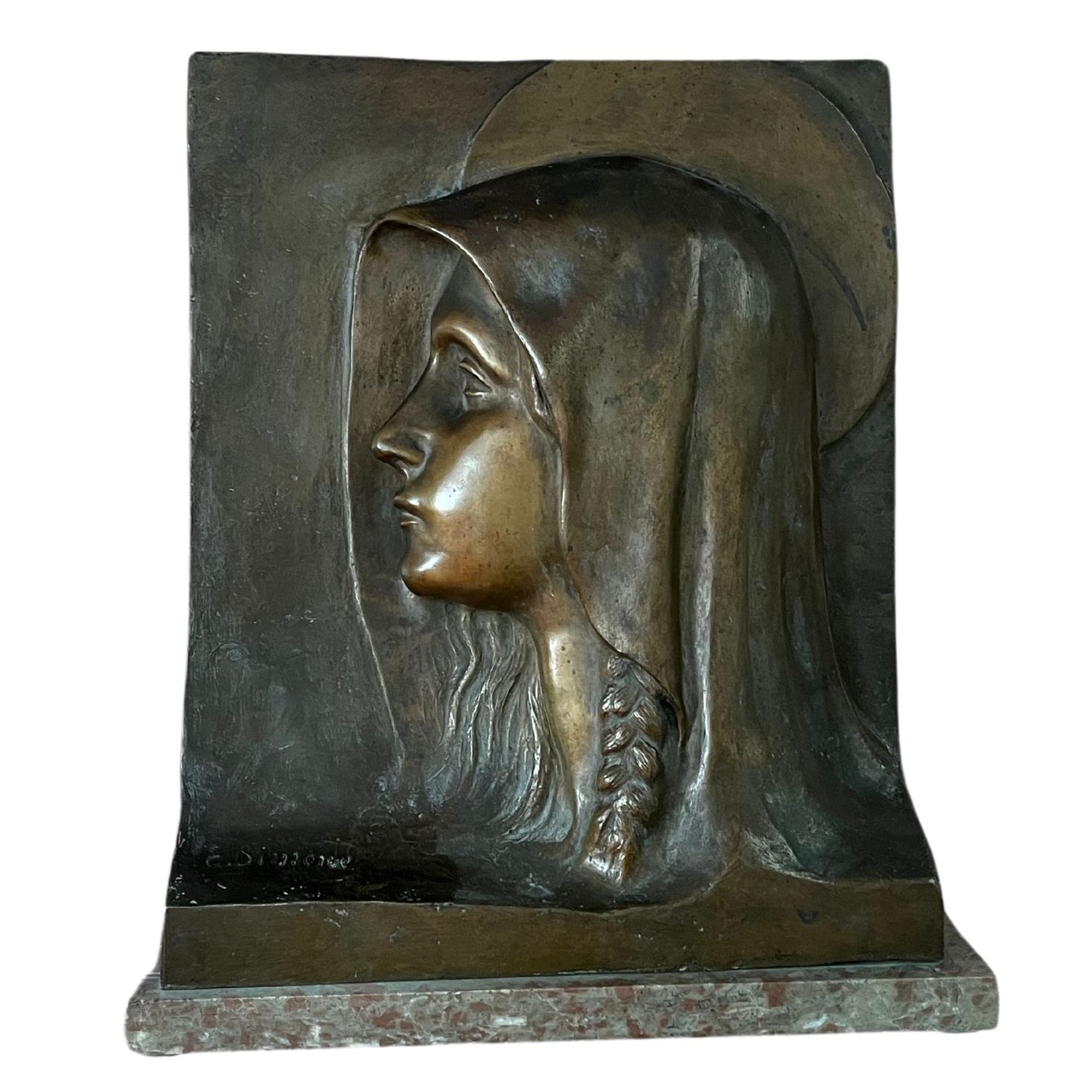 Scultura in bronzo firmato in basso a sinistra E.Simone poggiante su base in marmo, raffigurante Profilo di Vergine Maria.