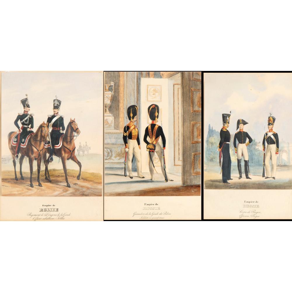 Lotto di tre stampe raffiguranti figure in uniforme dell'esercito imperiale russo