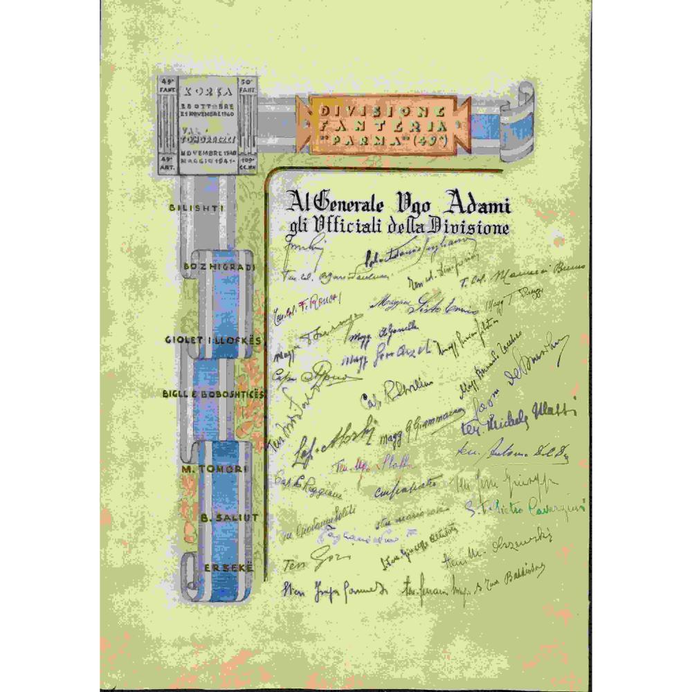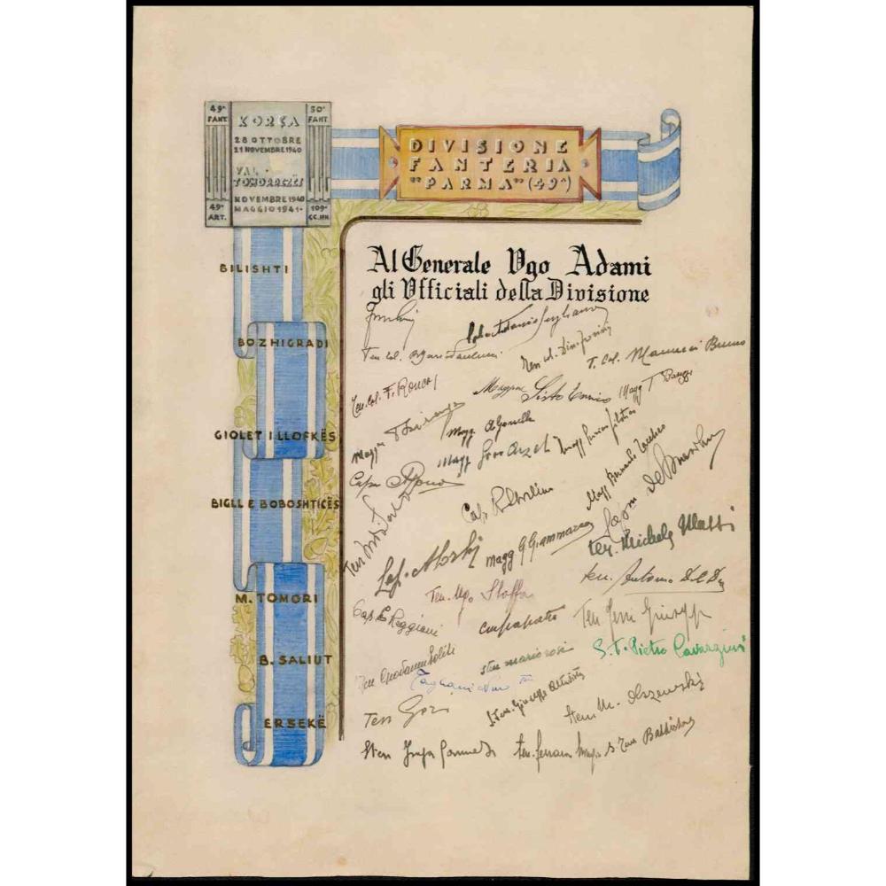 Foglio con dedica a Generale Ugo Adami dagli ufficiali della Fanteria Parma Militaria...
