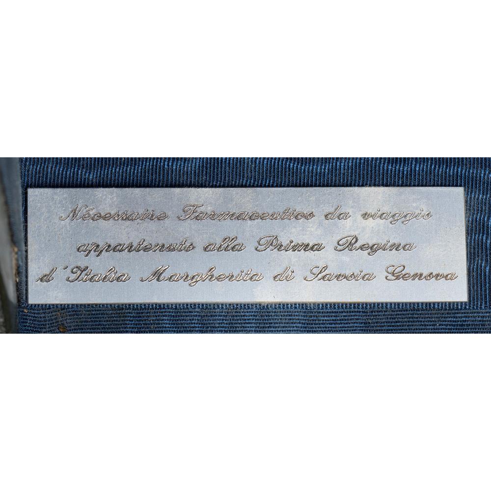 Cofanetto personale da viaggio con boccette medicinali della regina Margherita Casa Savoia e corti europee...