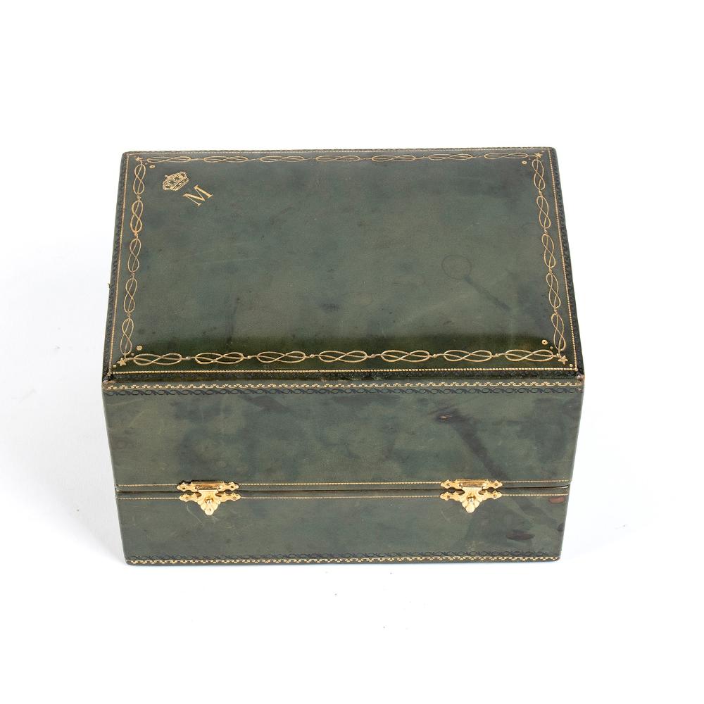 in marocchino verde con impressi nodi Savoia e monogramma reale, 12,5 x 18,5 x 13.5 cm, ottimo stato, raro