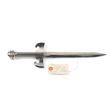 Bellissimo Gladio con impugnatura in verghe di fascio con guardia a doppia scure, pomolo a forma di "profilo continuo del Duce", brevetto del 1933 dello stesso Bertelli, lama nichelata in fodero di pelle con la sole funzione protettiva. Al gladio è allegata una vecchia targhetta in cui si specifica che la nichelatura è stata fatta a Firenze nel 1932. Provenienza: famiglia dell'artista.