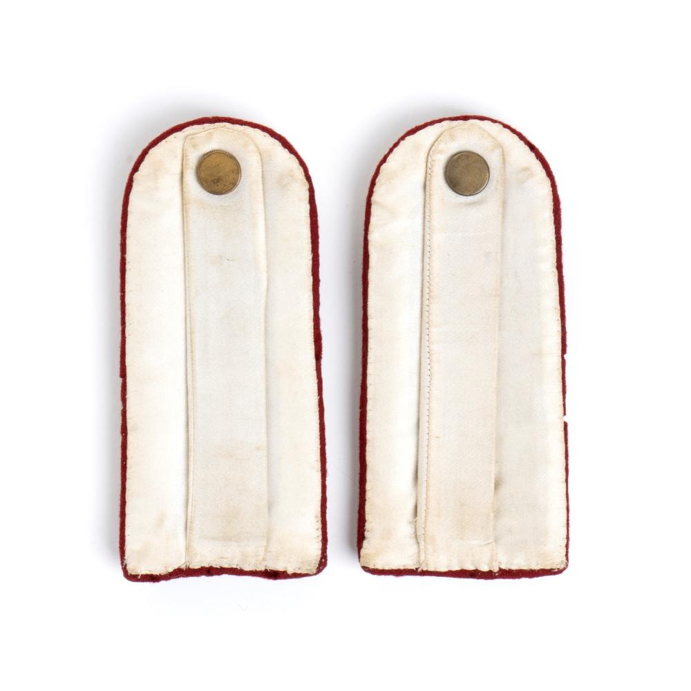 Bellissime controspalline in lastra dorata con ricami in canottiglia, filettate di rosso amaranto e sottopannate con cotone bianco, ottimo stato