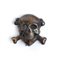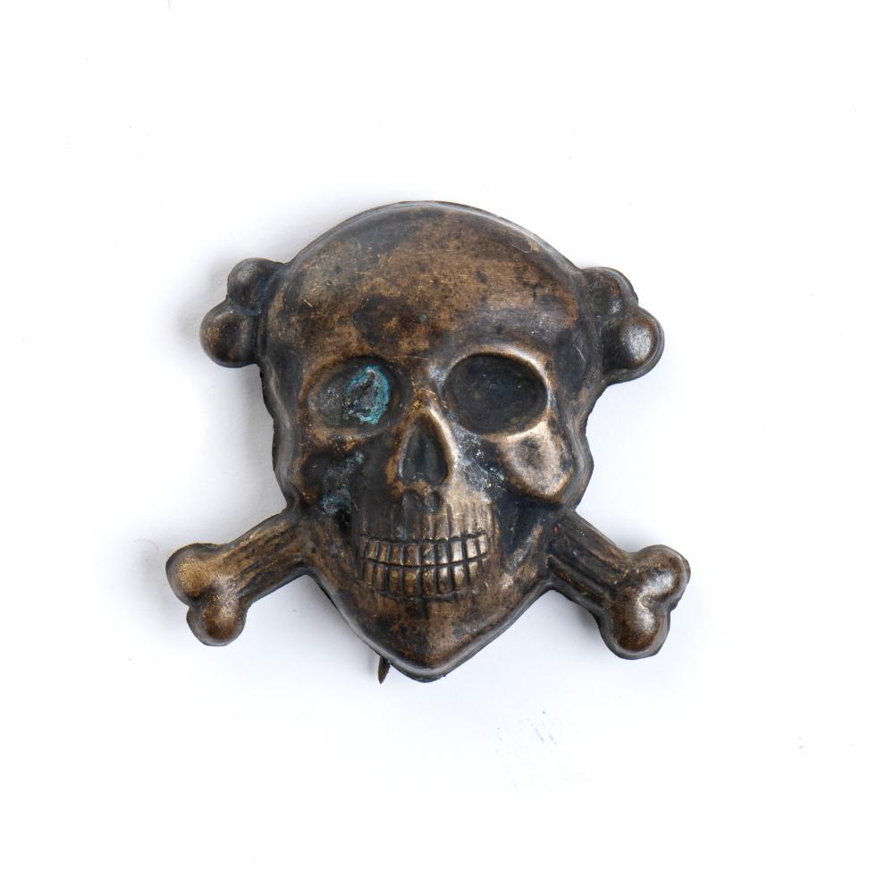 Teschio con tibie n ottone stampato ,al verso spilla verticale in ferro saldato a stagno, fregio usato generalmente dalla GNR ed altri reparti d'elite del Regio esercito e da varie formazioni della RSI, tracce di ossidazione.