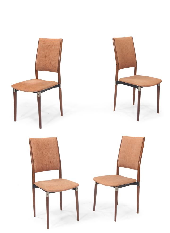 Quattro sedie in alluminio pressofuso, legno di palissandro e rivestimento in tessuto.