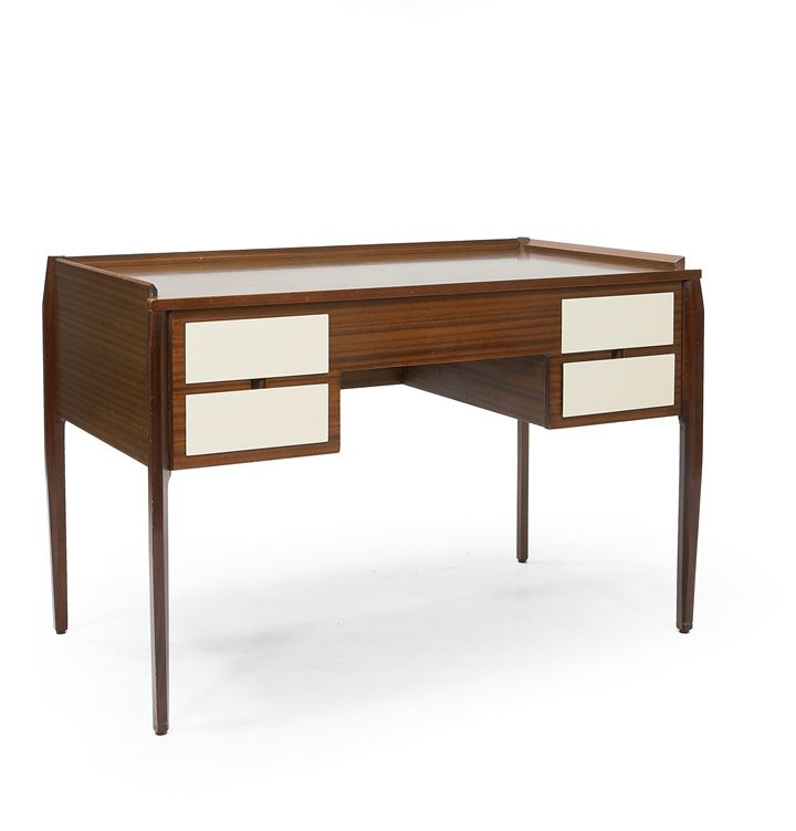 Scrivania da centro con struttura in legno di mogano e impiallacciatura in mogano, cassetti laccati.