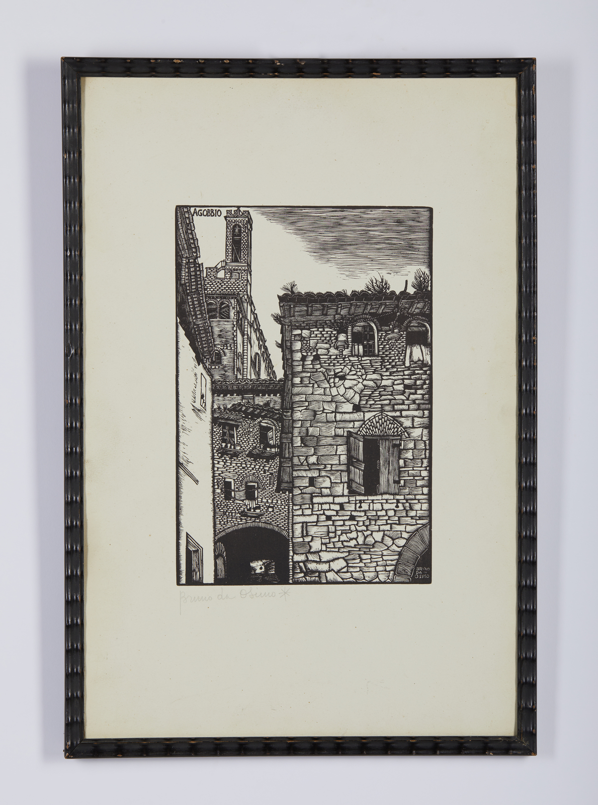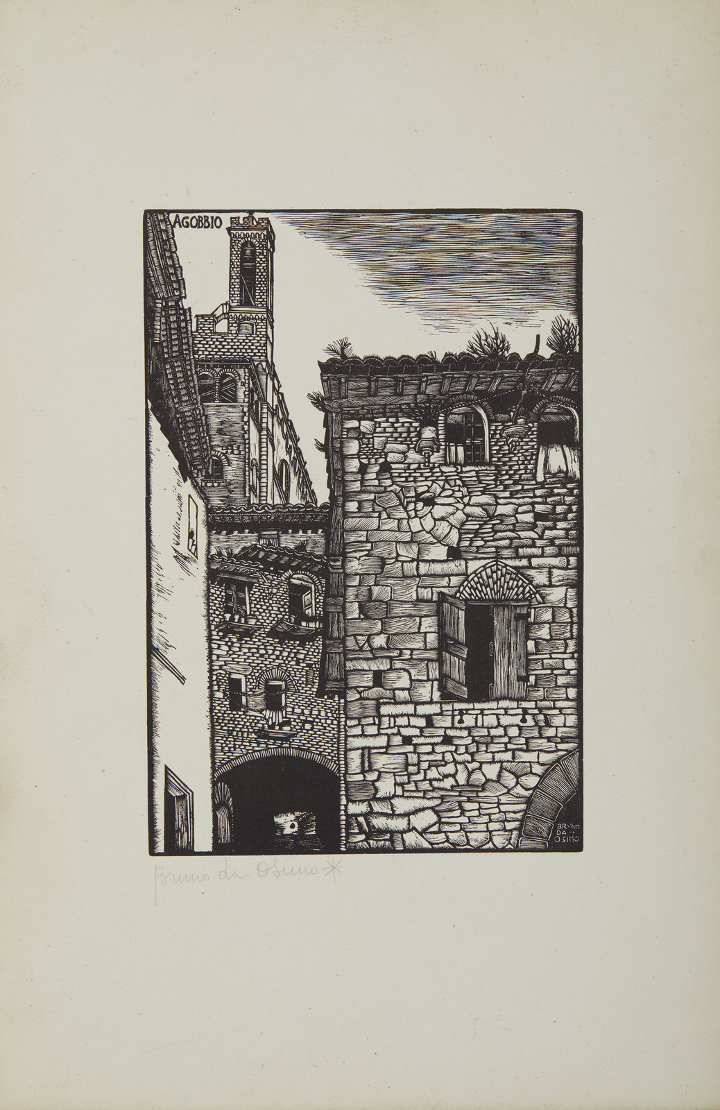 DA OSIMO BRUNO (1888 - 1962) Agobbio. Xilografia. Cm 34,50 x 52,00. Firma in basso a sinistra a matita e in basso a destra a lastra. Titolo in alto a sinistra in lastra. Dimensione lastra: 30x20 cm. Lievi difetti. Cornice presente