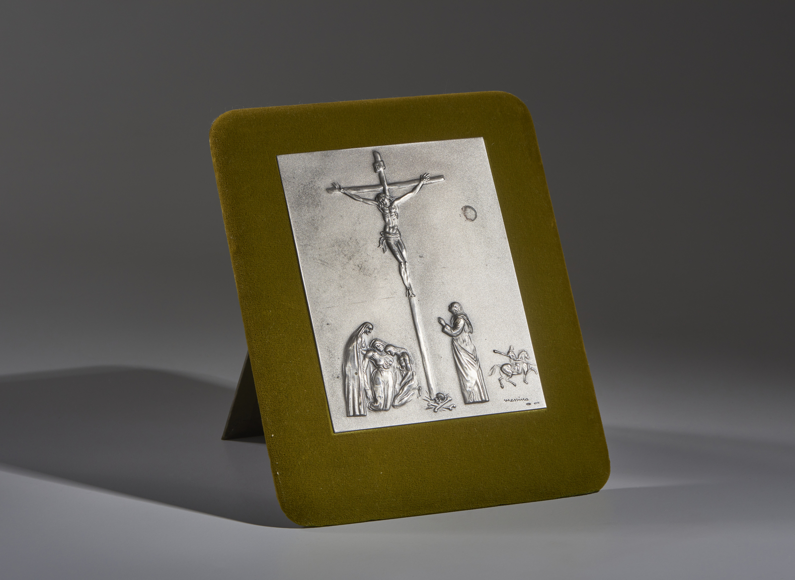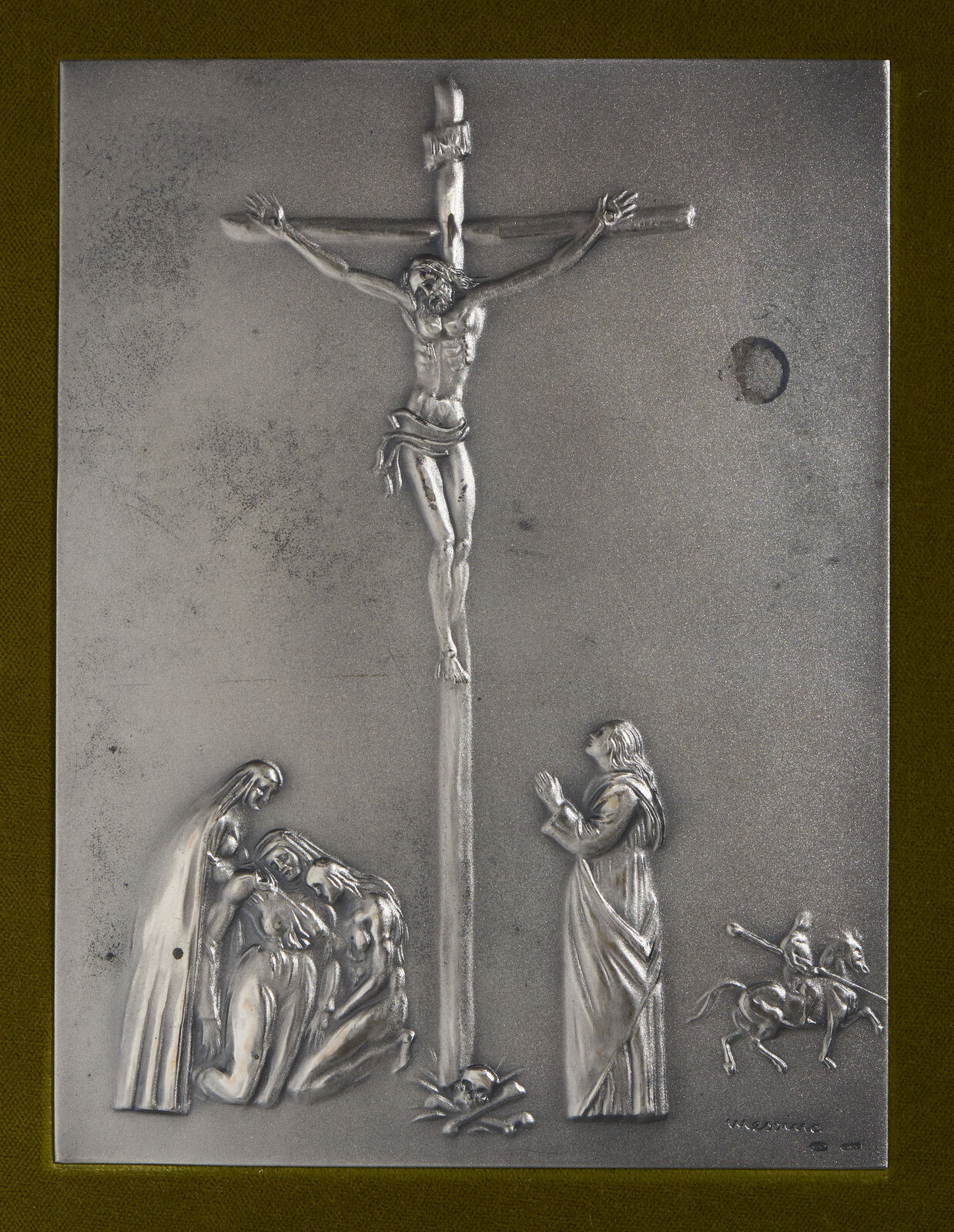 MESSINA FRANCESCO (1900 - 1995) Crocifissione. bassorilievo. Cm 11,00 x 15,00. Firma incisa in basso a destra. Punzone argento 829 in basso a destra. Cornice presente
