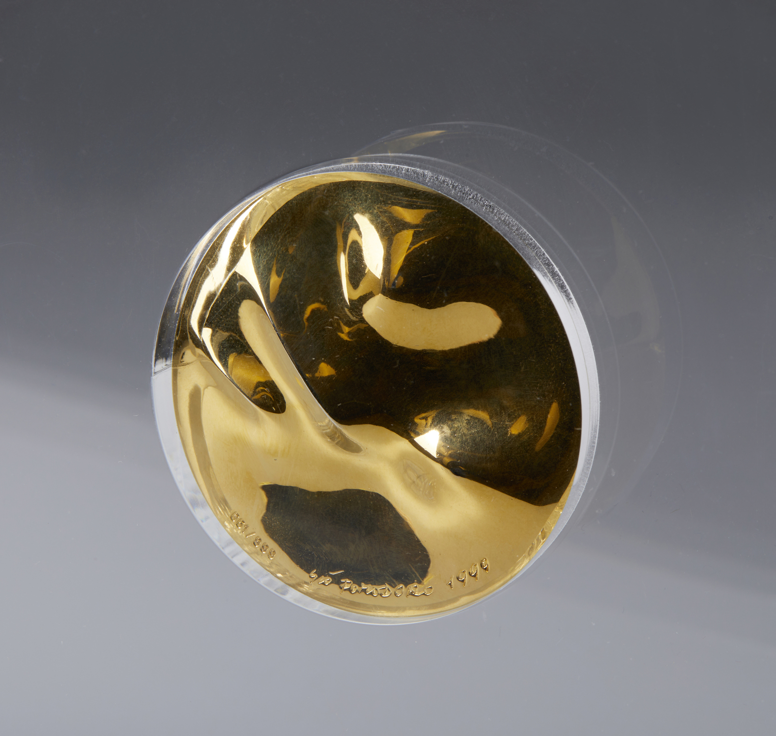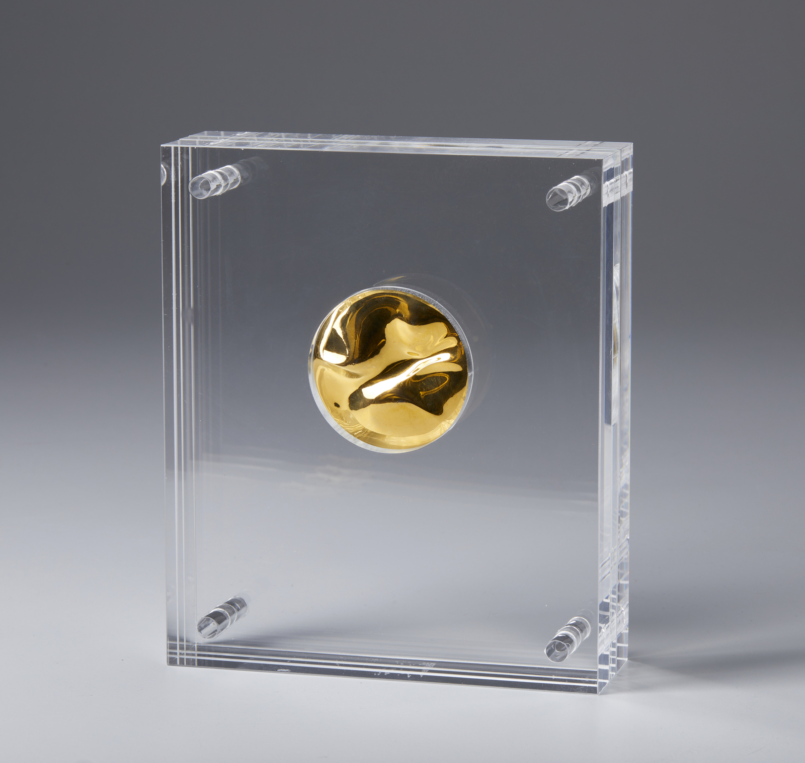POMODORO GIO' (1930 - 2002) Dalla serie "Il secolo della scultura Italiana". 1999. Bronzo.. Cm 16,00 x 19,00 x 5,00. 661/999. Tiratura, firma e anno incise. Diametro opera:5,5cm entro teca di plexiglass.