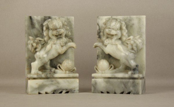 Due fermalibri in alabastro scolpito raff. ''CANI DI FO''. Cina. XX secolo. Mis. Lung. cm. 12 Alt. cm. 18 Prof. cm. 5,5 ca.