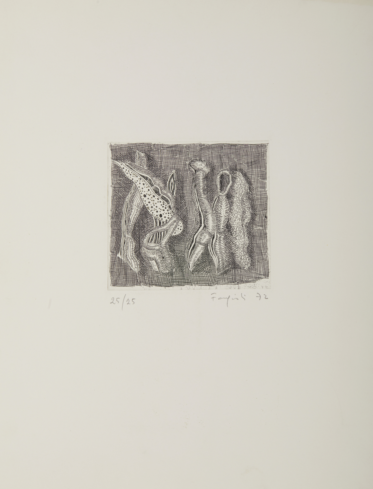 FORGIOLI ATTILIO (n. 1933) Senza titolo. 1972. Acquaforte. Cm 39,50 x 50,00. 25/25. Tiratura, firma e anno in basso a matita. Dimensione lastra:14.5x16 cm. Lievi difetti.