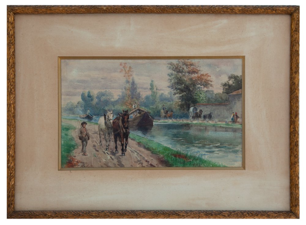 Leopoldo Burlando Milano 1841 - 1915 Sul Naviglio Acquarello su carta cm 25x42 firmato in basso a sx