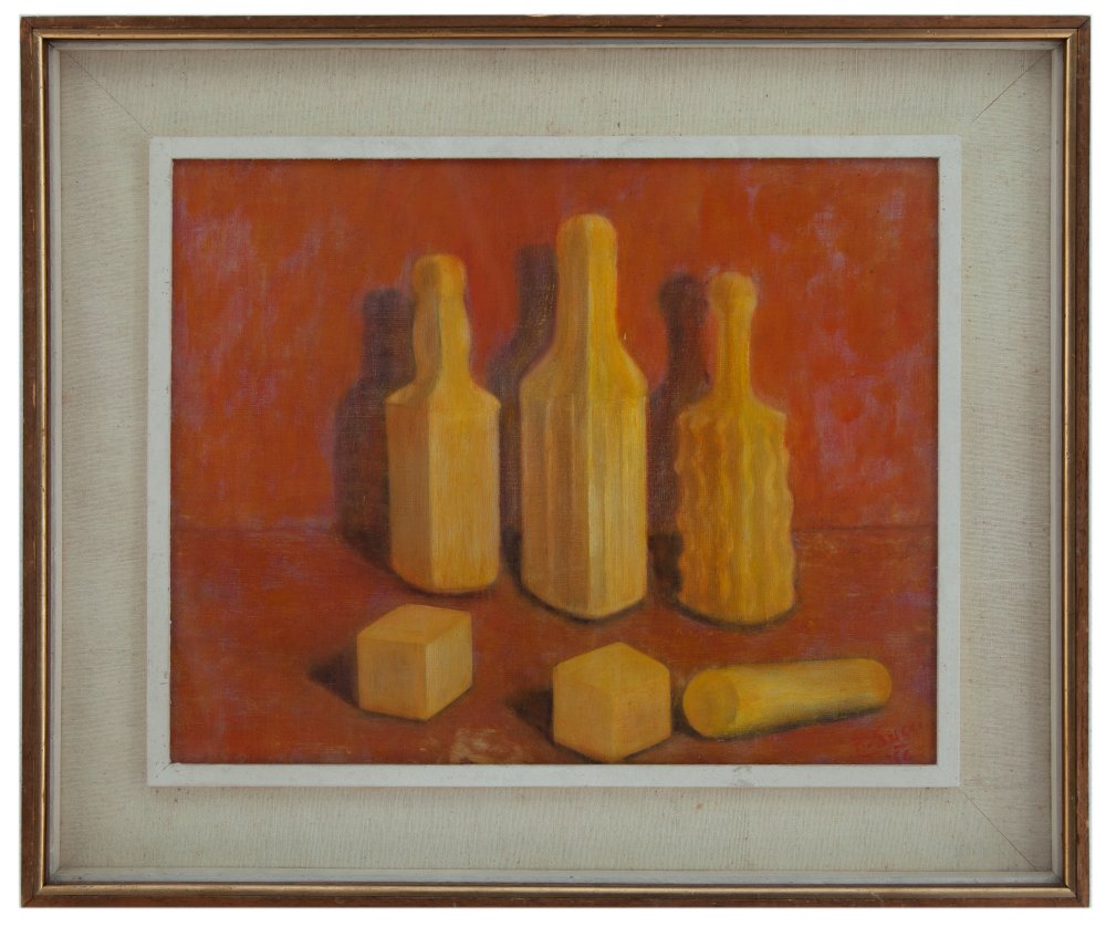 Pio Succi Nizza Monferrato (AT) 1929 - 2007 Natura morta con bottiglie Olio su tela cm 40x50 firmato in basso a dx datato 1966