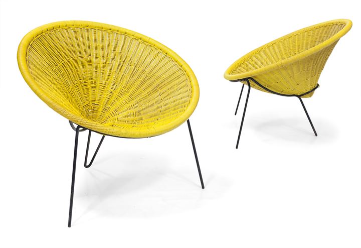 Due poltroncine con struttura in ferro verniciato, corda in plastica e midollino.