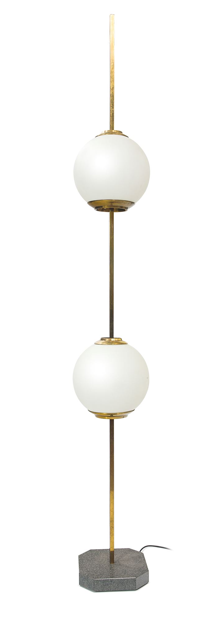 Lampada da terra con base in marmo, montatura in ottone lucido e globi in vetro opalino.
