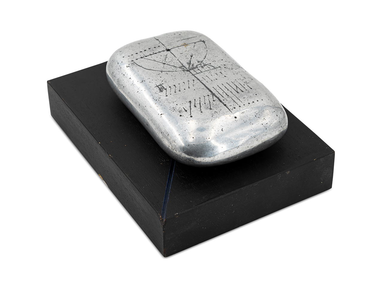 Scultura in bronzo lucido inciso poggiante su base in legno