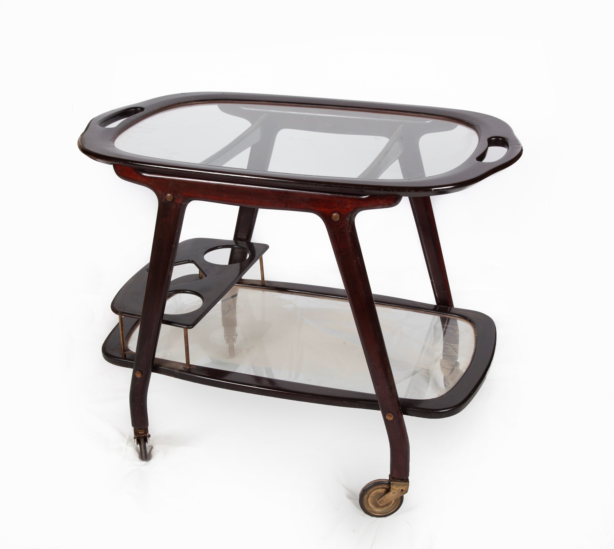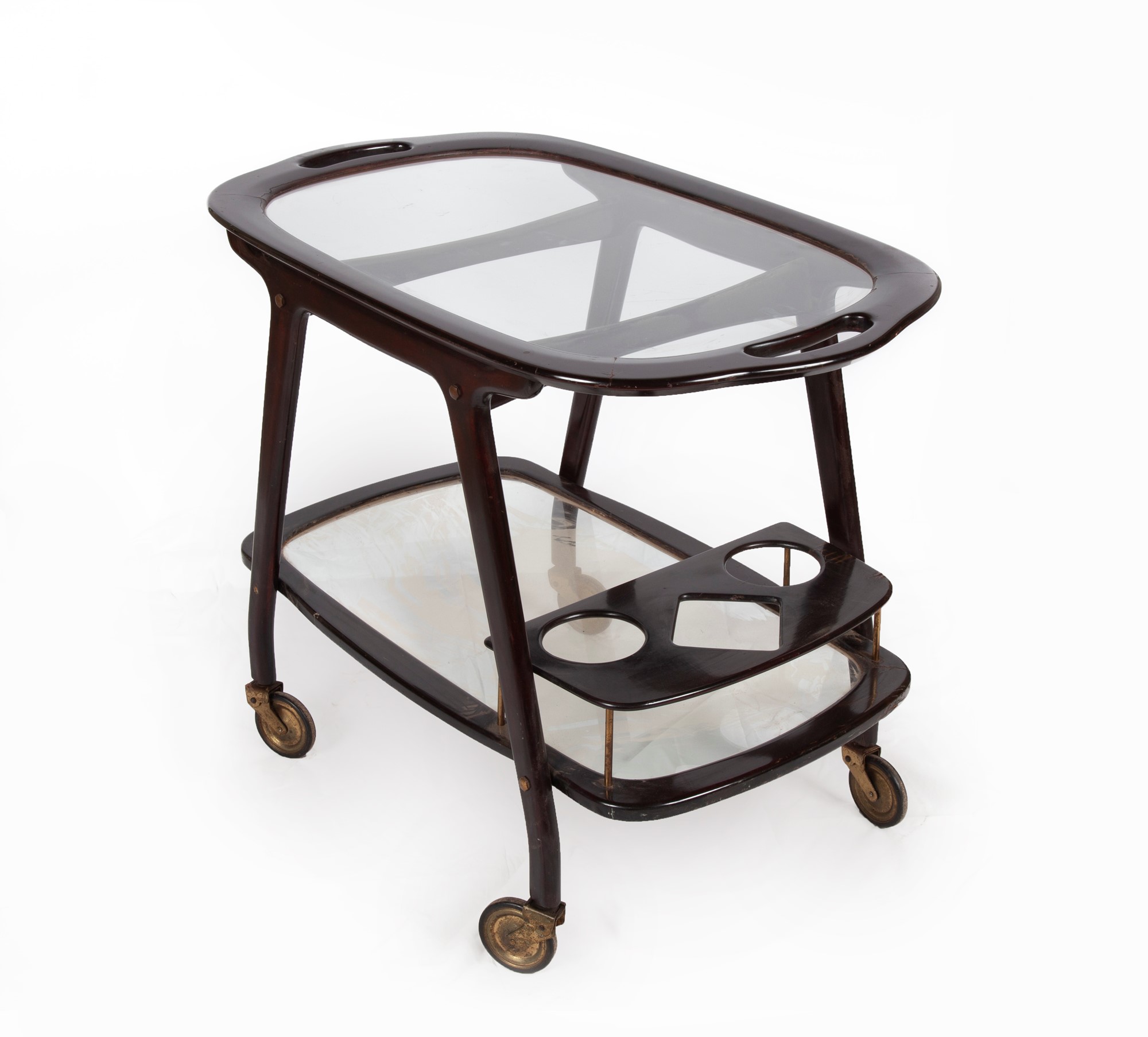 Cesare Lacca Napoli 1929 Carrello cm 63x80x48 Struttura in legno con piani in vetro e ruote in ottone.