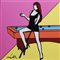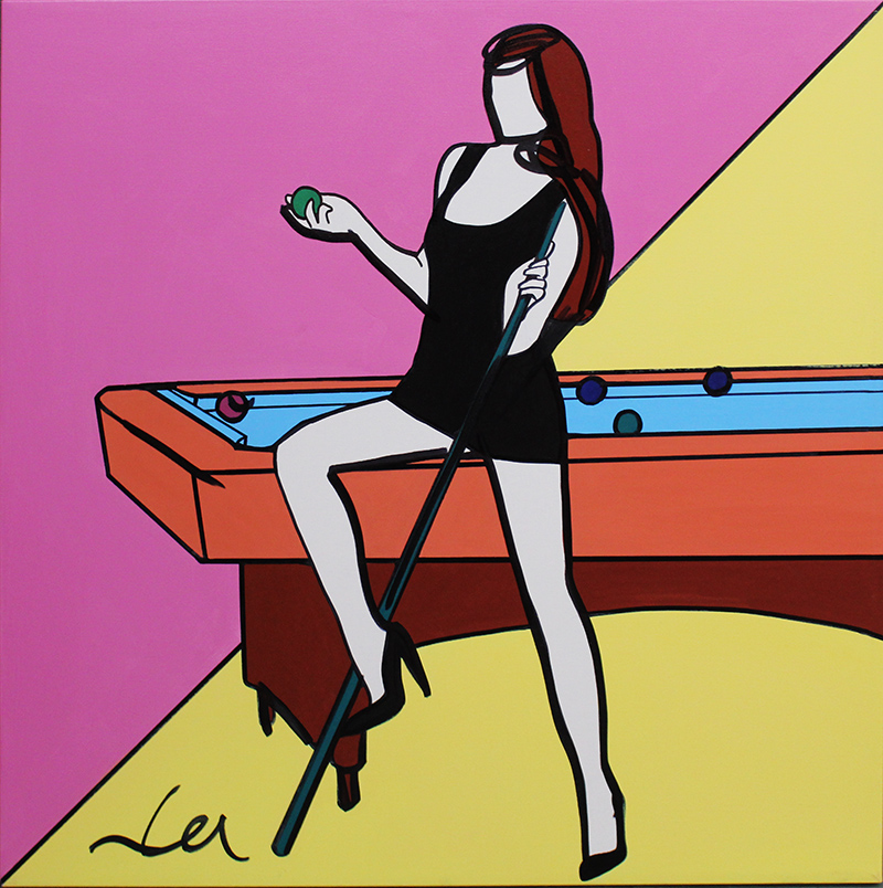 MARCO LODOLA, "Ragazza al biliardo", anni 2000, acrilico su tela, dim 100x100, autentica su foto dell'artista, al fronte: firma