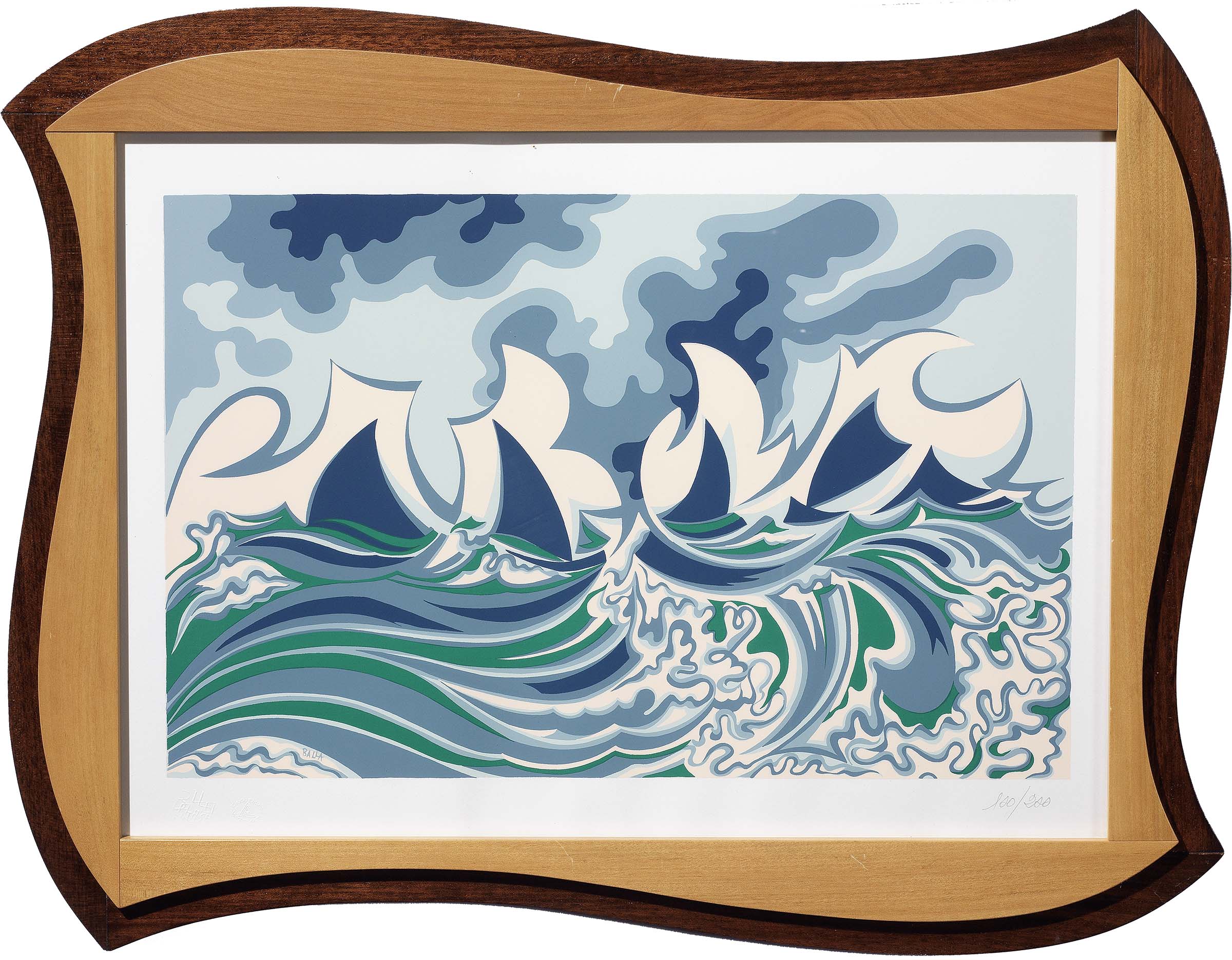 Giacomo Balla Torino 1871 - Roma 1958 Marvento Serigrafia a colori, es. 100/200, cm. 50x70 Firma in lastra in basso a sinistra: Balla, a matita sul margine in basso a destra tiratura: 100/200, in basso a sinistra: timbri a secco Balla / Futurista e Claudio Barbato / Venezia Spinea. Al verso dichiarazione di autenticità con firme di Luce ed Elica Balla. Serigrafia a colori tratta da Marvento, 1919, tiratura di 200 esemplari, stampatore Claudio Barbato, (Spinea) Venezia.