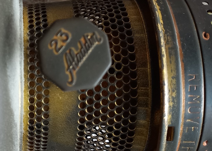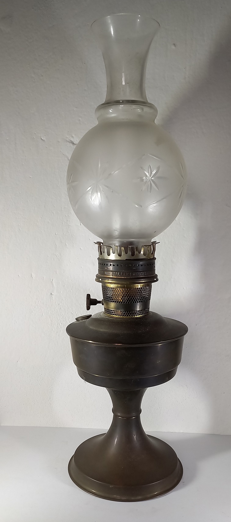 LUME A PETROLIO IN METALLO - PARALUME IN VETRO SATINATO E DECORATO H.CM.60 - MARCHIO ALADDIN