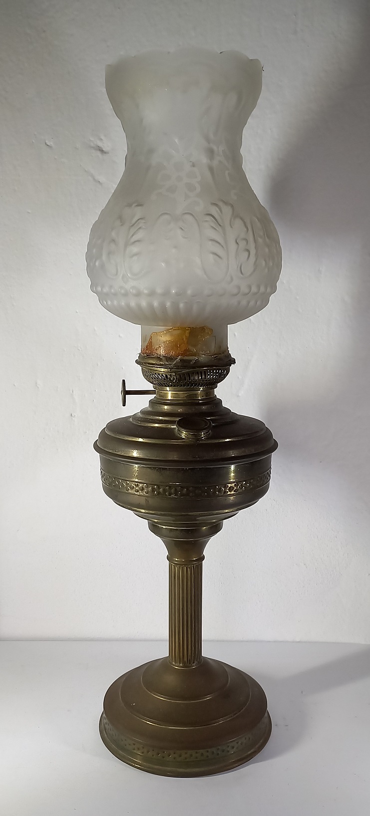 Lot 150 | LUME A PETROLIO IN METALLO SBALZATO E BRUNITO - PARALUME IN VETRO DECORATO...