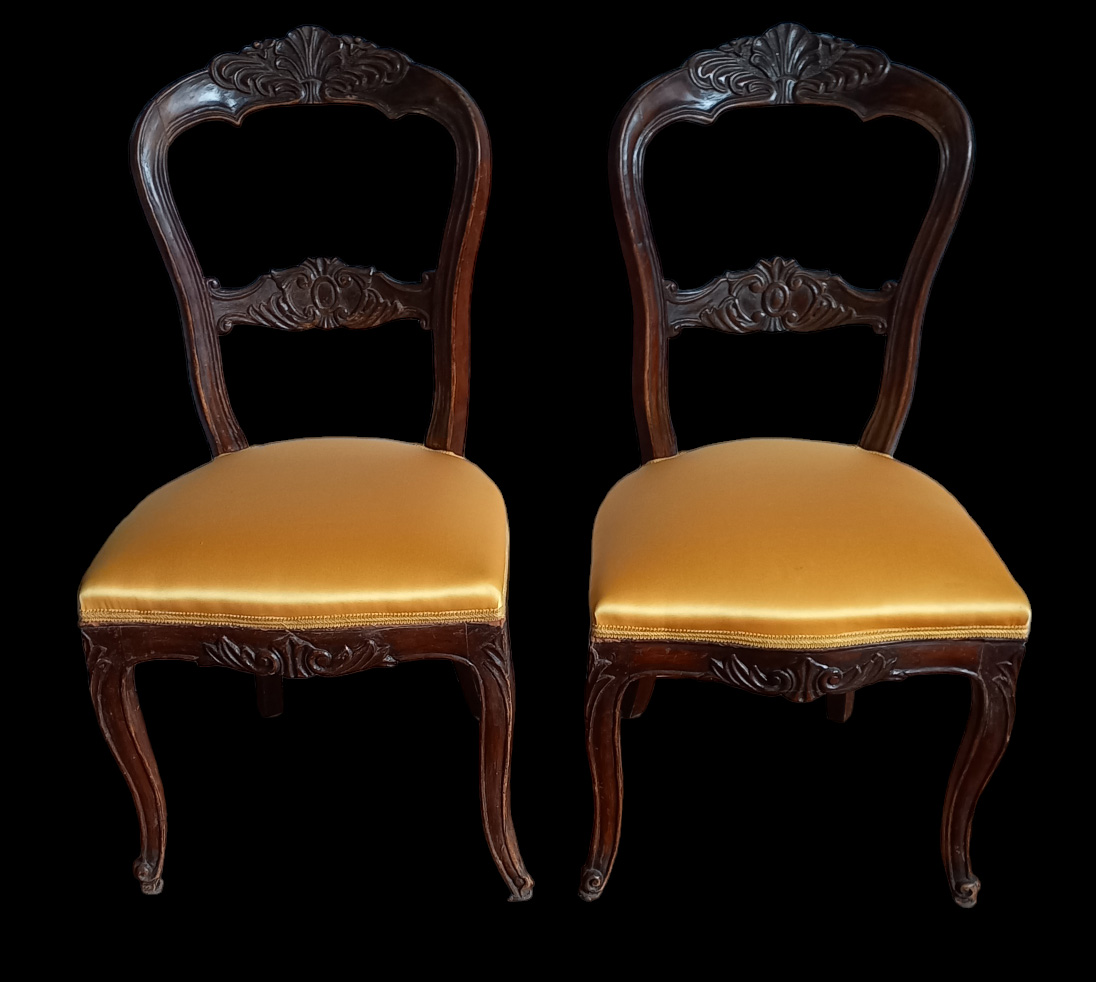 DUE SEDIE LUIGI FILIPPO IN LEGNO INTAGLIATO TINTO CON SEDUTA IN RASO - XIX SECOLO - LIEVI DIFETTI