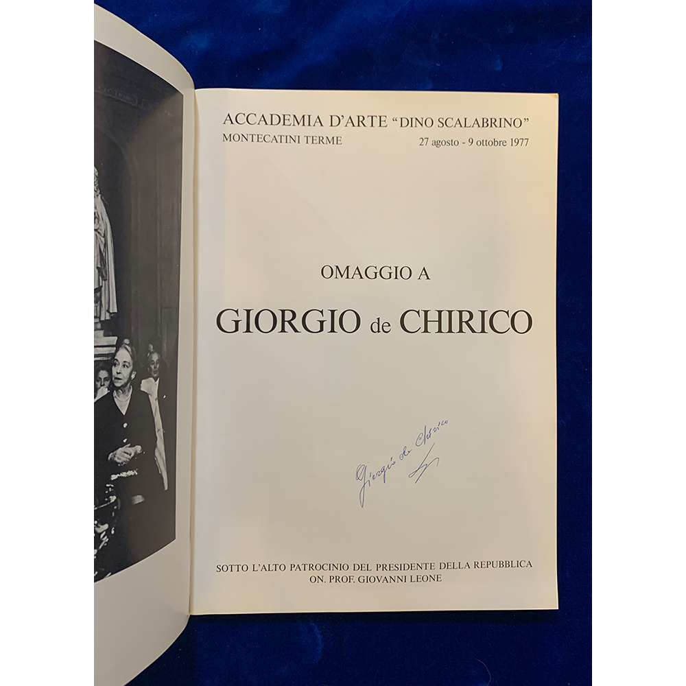 2) Omaggio a Giorgio De Chirico, catalogo della mostra, Montecatini Terme Accademia d'Arte Dino Scalabrino, 27 agosto - 9 ottobre 1977, cm 30x21. Autografato dal pittore.