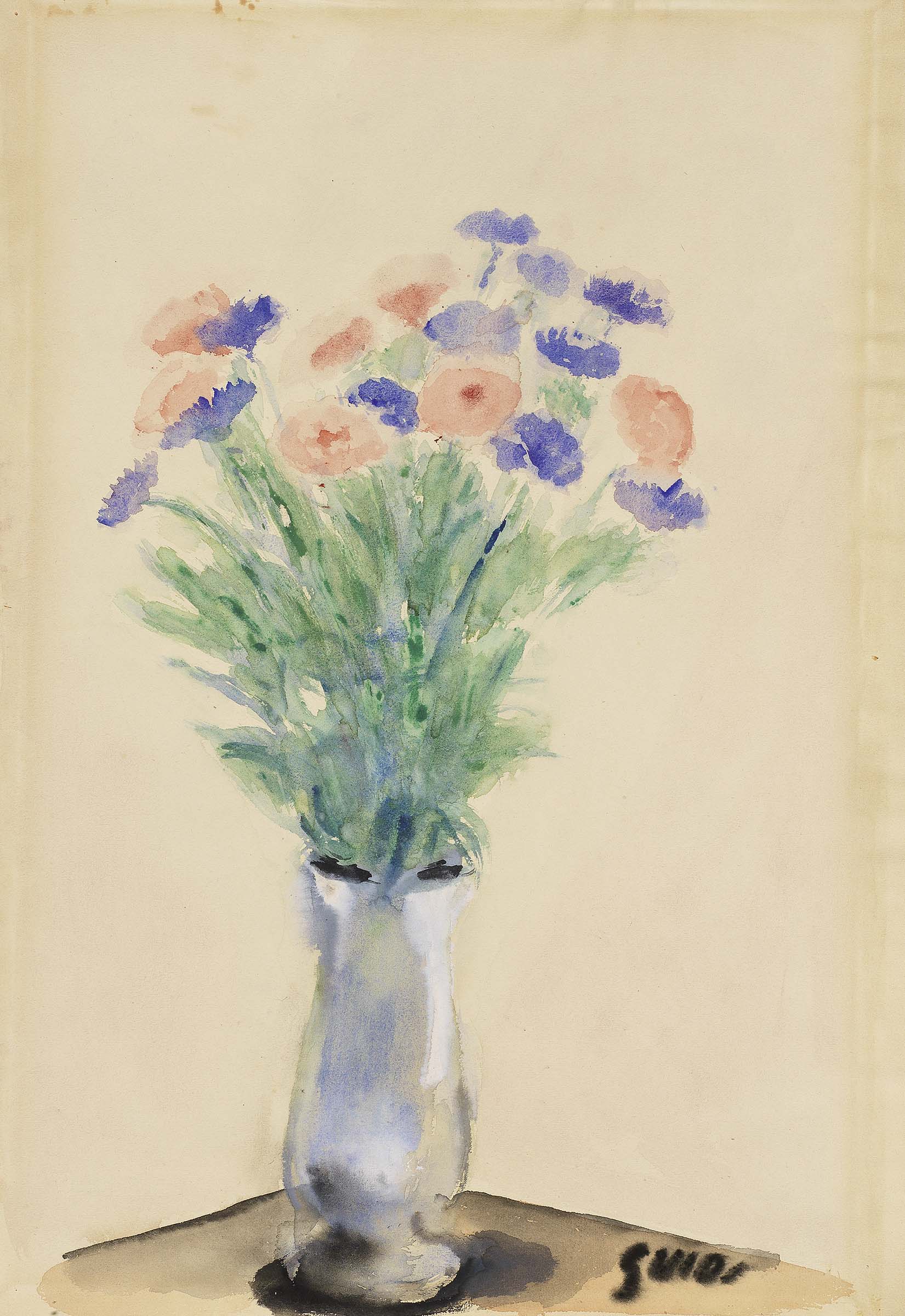 Virgilio Guidi Roma 1891 - Venezia 1984 Fiori Acquerello su carta, cm. 47,5x33 Firma in basso a destra: Guidi. Al verso, su un cartone di supporto: etichetta Raccolta di Nino Carozzi - Lerici. Foto autenticata dall'artista. Esposizioni: Grande giardino. Rassegna d'arte contemporanea, Pescia, Palagio, 31 agosto - 29 settembre 1996, cat. p. 11.