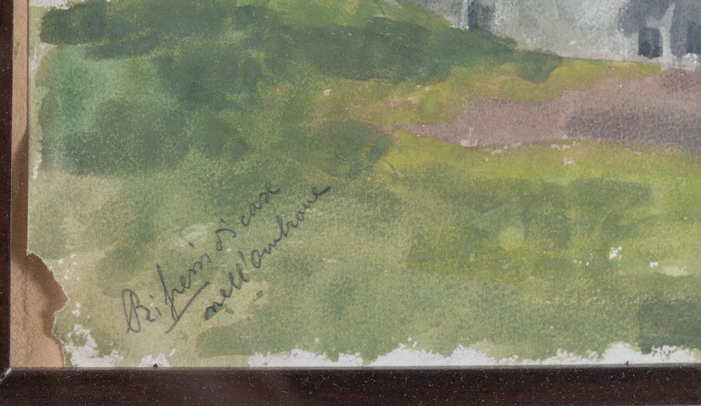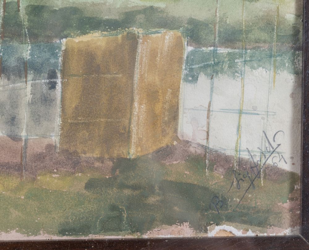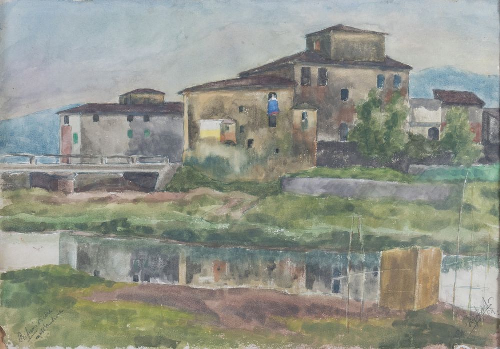 SIGFRIDO BARTOLINI (Pistoia 1932 – Firenze 2007) "Riflessi di case nell'Ombrone", 1964. Tecnica mista su cartoncino. Cm 35x50. Opera firmata e datata in basso a destra B. Sigfrido, 64. Opera intitolata in basso a sinistra Riflessi di case nell'Ombrone.