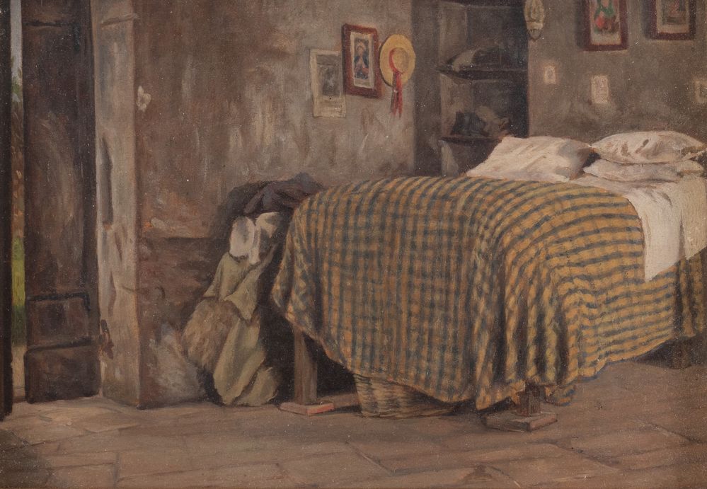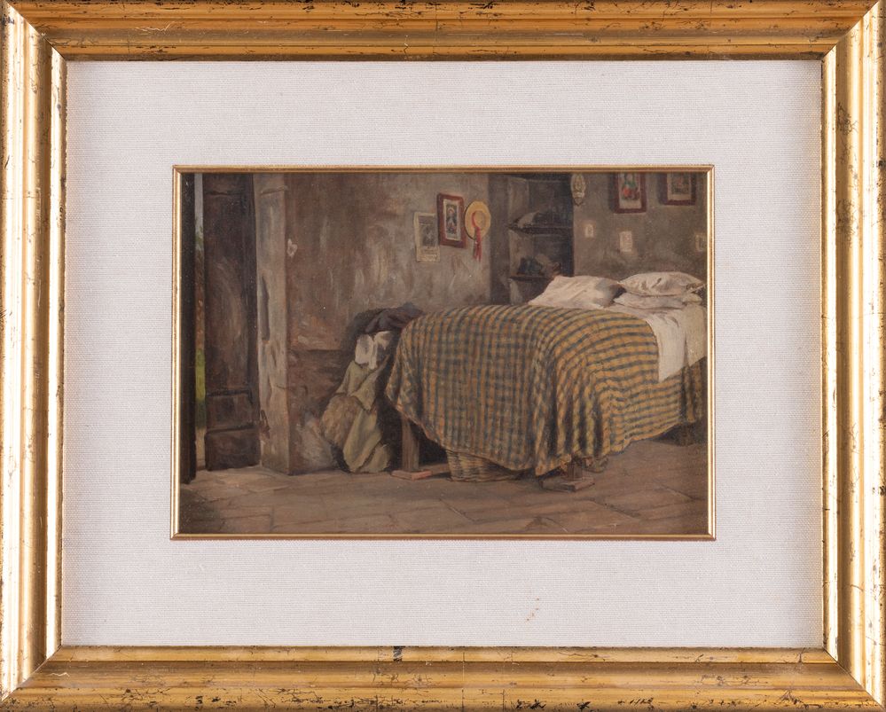 Pittore anonimo del XX secolo. "Camera del gondoliere". Olio su tavola. Cm 18,5x26,5.