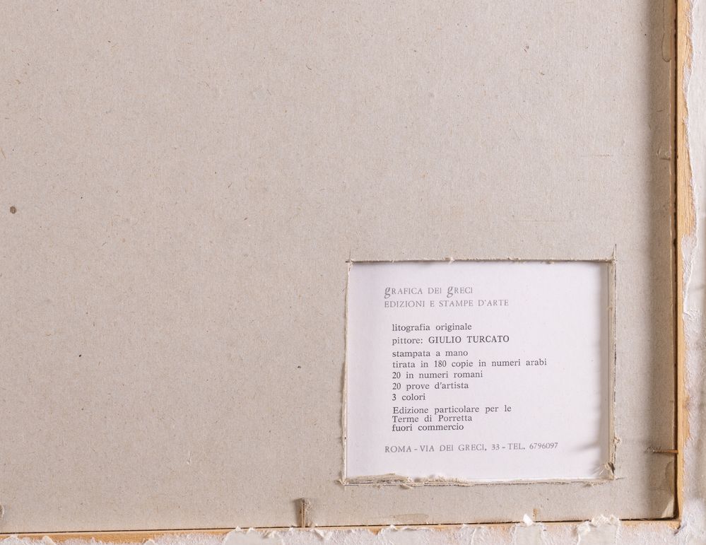 GIULIO TURCATO (Mantova 1912 - Roma 1995) "Senza titolo". Litografia a colori su carta. Cm 49x69,5. Opera firmata in basso a destra Turcato. Reca in basso a sinistra numero di tiratura 90/180. Al retro reca etichetta Grafica dei Greci, Edizioni e Stampe d'Arte. Edizione particolare per le Terme di Porretta, fuori commercio.