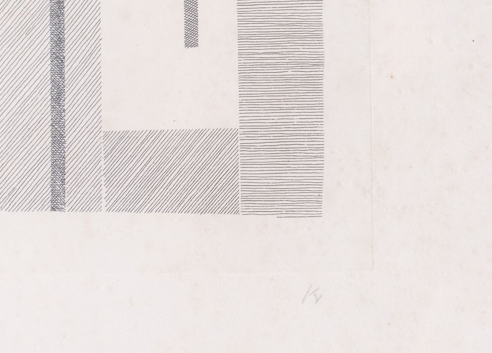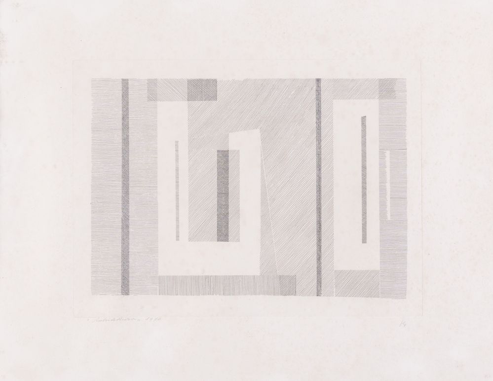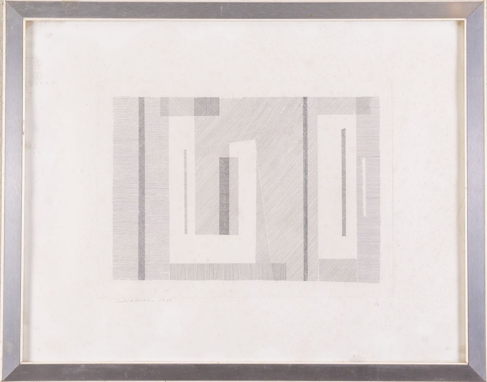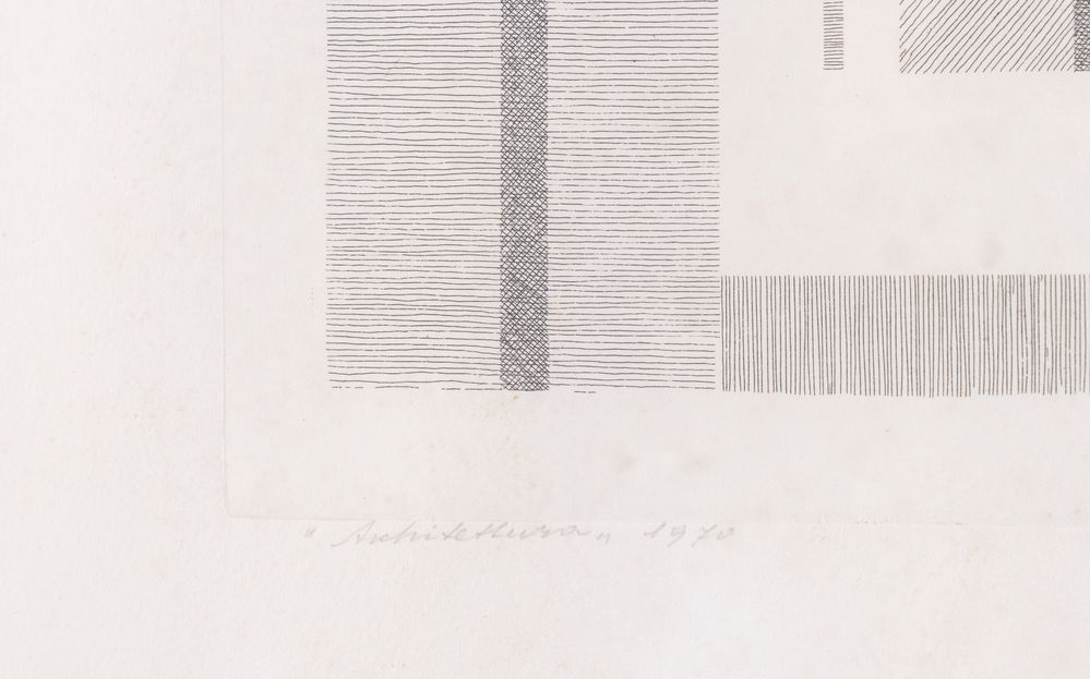 GIOVANNI KOROMPAY (Venezia 1904 – Rovereto 1988) "Architettura", 1970. Incisione su carta. Cm 25x35. Opera siglata in basso a destra K. Opera intitolata e datata Architettura 1970.
