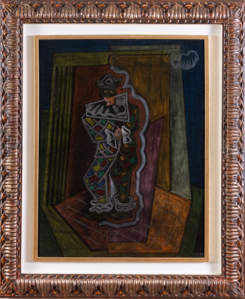PIPPO ORIANI (1909-1972) "Arlequin", periodo parigino. Pastello su duvet pastel. Cm 70x50. Opera firmata in basso a destra Oriani. Al retro opera intitolata e firmata Arlequin, Pippo Oriani.