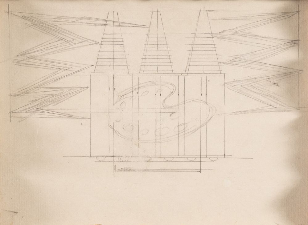FORTUNATO DEPERO (Fondo 1892 - Rovereto 1960) "Accumulatore e tavolozza", 1936 circa. Matita su carta. Cm 20x28,7. La composizione è da collegarsi alla progettazione delle scenografie per le scene della serata di poesia e pittura "All'insegna della tavolozza" tenutasi al Teatro Zandonai nell'ottobre del 1936 a conclusione della "Festa del vino" (dall'autentica di Maurizio Scuderio). Certificato di autenticità Archivio Unico per il Catalogo delle opere futuriste di Fortunato Depero, num. FD-3741-DIS.