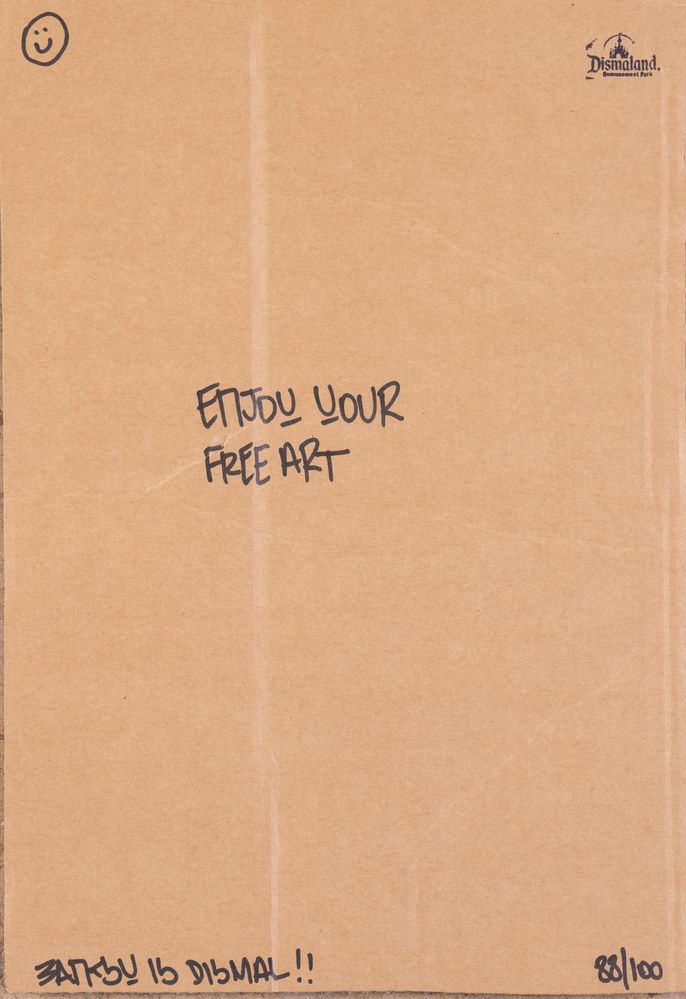 BANKSY (Bristol 1974) "Girl with balloon". Spray su cartone. Cm 37x25,5. Al retro reca numeri di tiratura 88/100. Al retro reca timbro Dismaland. Opera accompagnata da ticket d'ingresso a Dismaland.