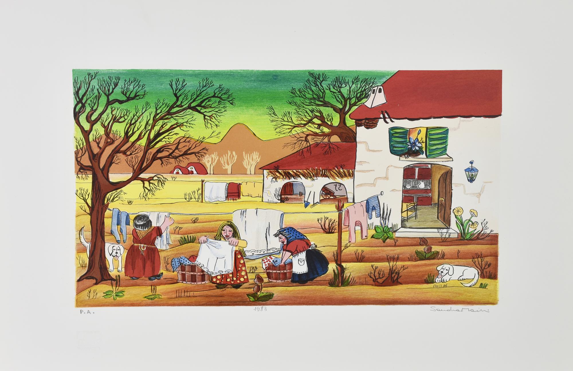 Sandra Maini IL GIORNO DEL BUCATO, 1983 serigrafia, cm 50x70; es. PROVA...