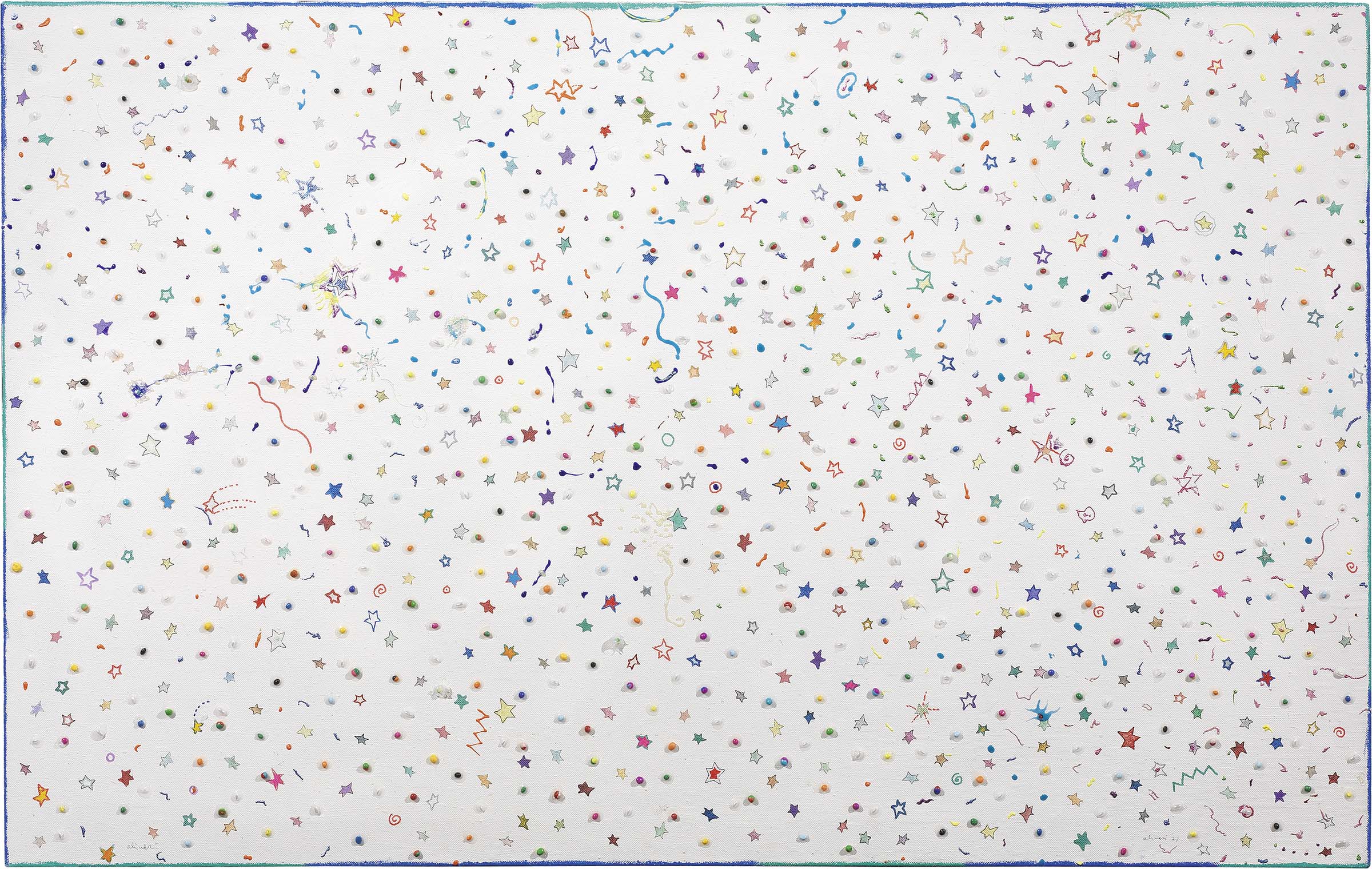 Luca Alinari Firenze 1943 Quelle cose che non sappiamo come dipingere, 1975 Tecnica mista su tela, cm. 100x160 Firma e data in basso a destra: Alinari 75, firma in basso a sinistra: Alinari; al verso sulla tela titolo, data e scritta: Quelle cose / che non sappiamo / come dipingere / '75 / Sperimentazione / anni 70: certificato firmato dall'artista, con data 2011 e n. X012: etichetta Mostra personale di / Luca Alinari / Castello Doria - Porto Venere / 2 Agosto - 17 settembre 2000 / opera n. 45. Storia: Galleria Il Milione, Milano; Collezione privata
