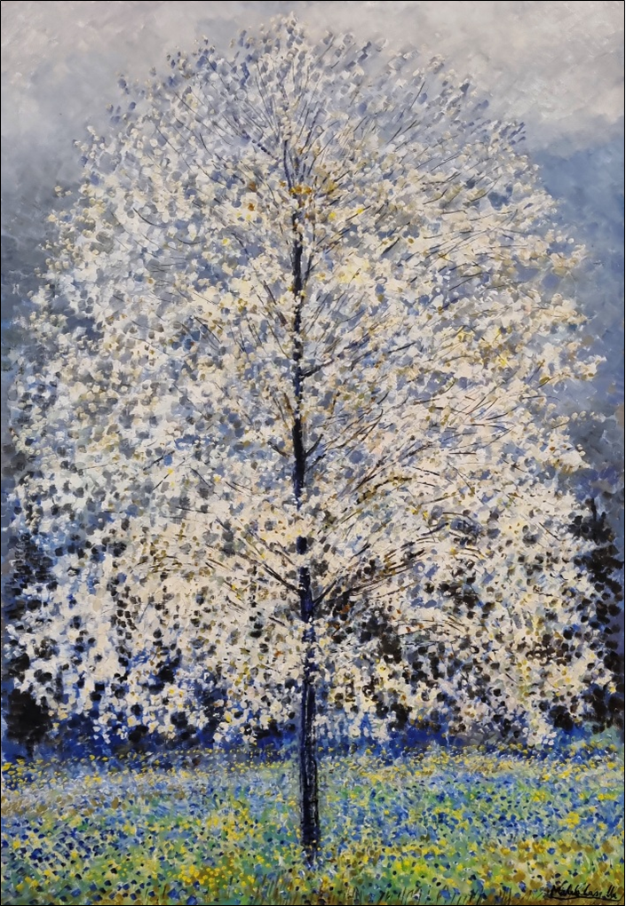 CASCELLA MICHELE Ortona 1892 - Milano 1989 "Albero fiorito" Olio su tela cm 70x100 del 1978. Firmato sul fronte in basso a destra. Sul retro etichetta descrittiva a cura della Galleria Bonaparte di Milano. Archivio su foto a cura dell'Archivio Generale dell'opera di Michele Cascella - Torcular Milano.