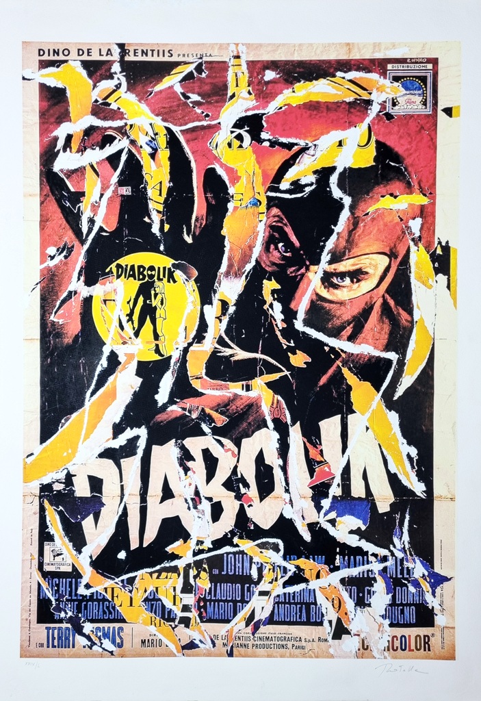 ROTELLA MIMMO Catanzaro 1918 - Milano 2006 "Diabolik" Multiplo decollage con strappi di manifesto applicati su supporto serigrafico, su cartoncino cm 70x100. Firmato sul fronte in basso a destra, tiratura XXIV/L a sinistra. Timbro a secco "Fondazione Rotella" a sinistra.