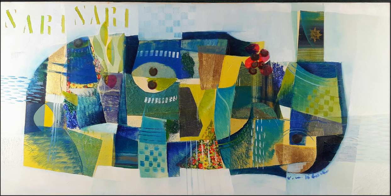 DI CARLO MARIO VITTORIO San Marco in Lamis 1939 - Milano 2015 "Sari Sari" Olio e collage su tela cm 120x60. Firmato sul fronte in basso a destra e al retro. Autentica e archivio dell'Artista su foto. Certificato di garanzia ed autenticità della Galleria Expertize Sas del Gruppo Petite Prince. Opera esposta ad Arte Fiera di Bari nel 2007.