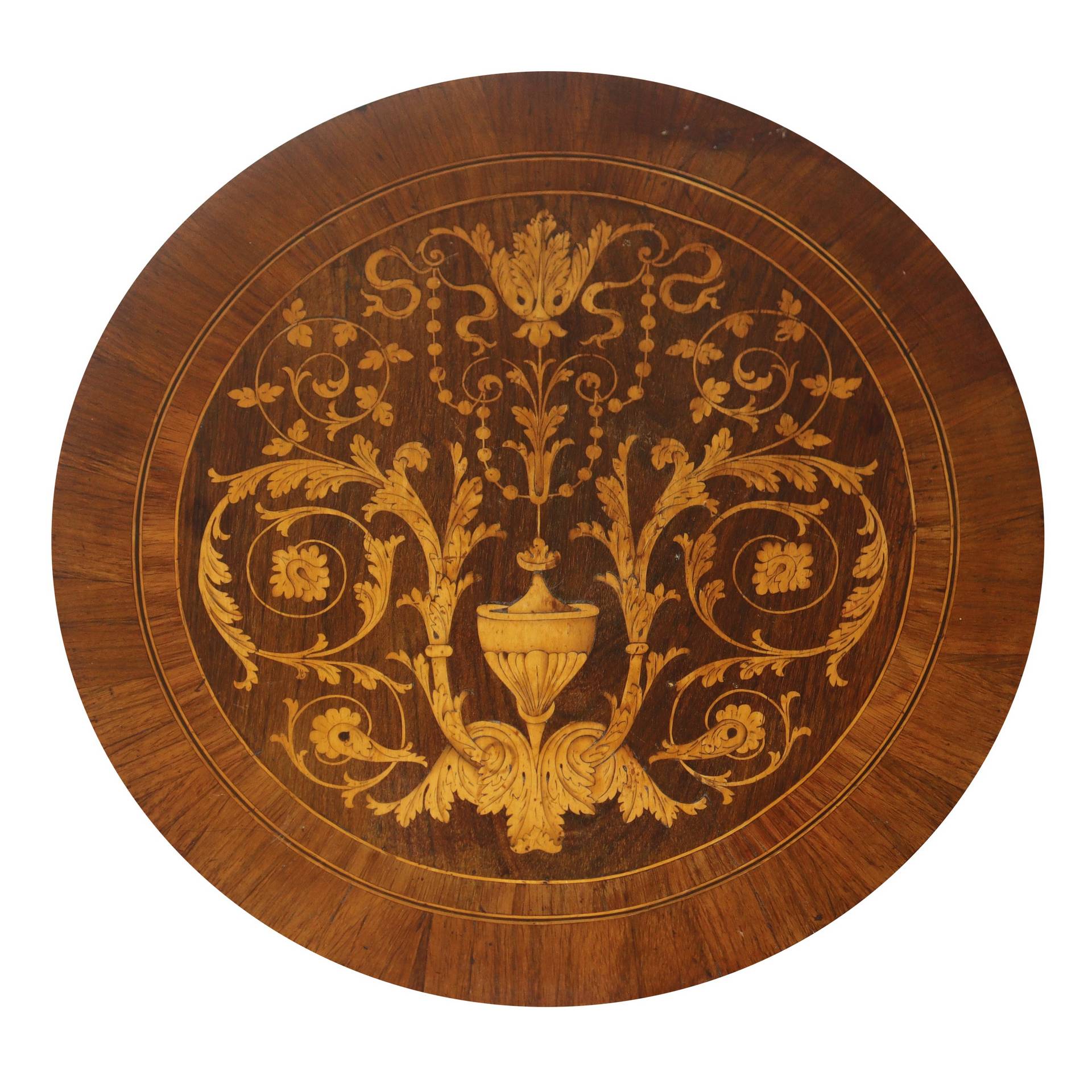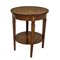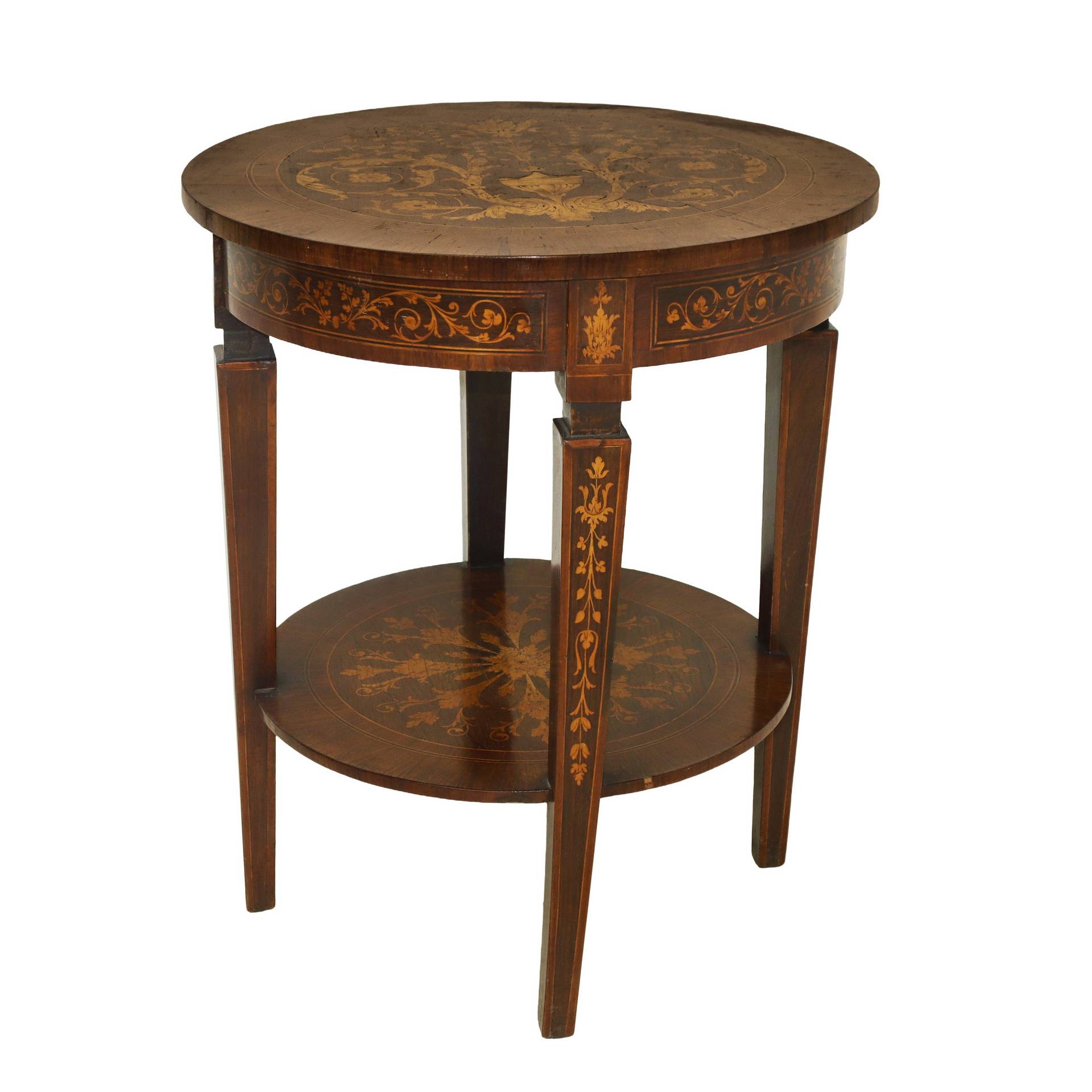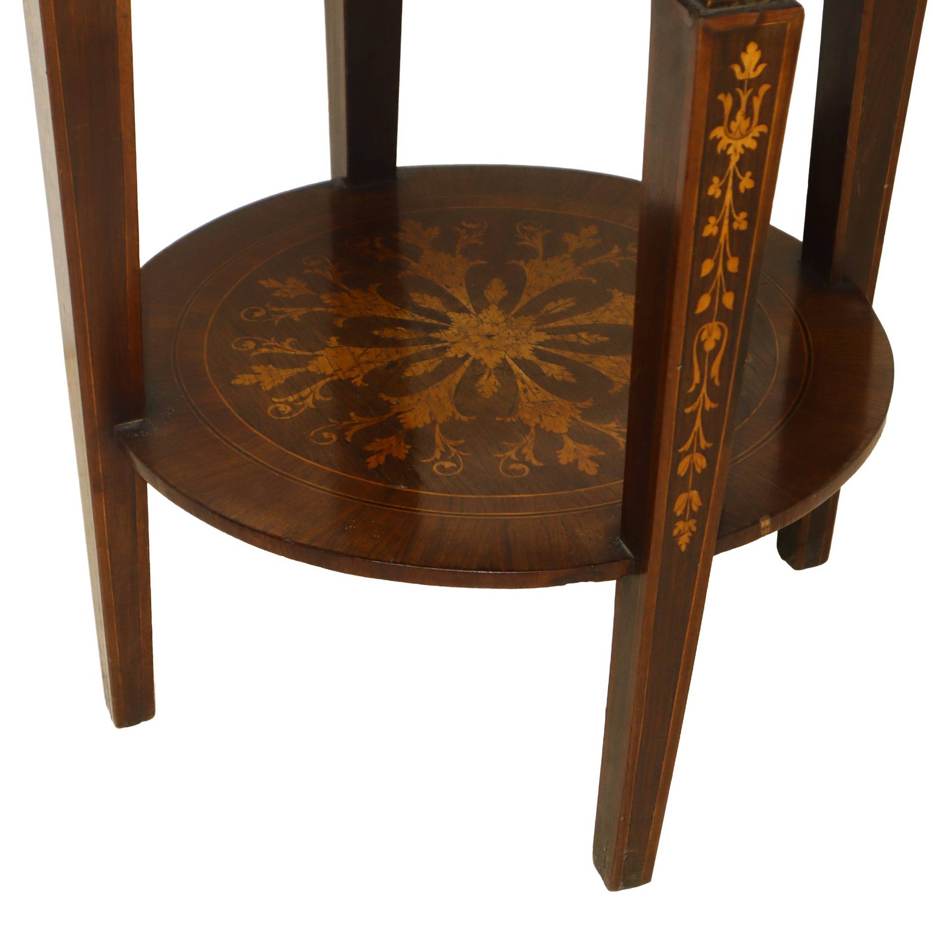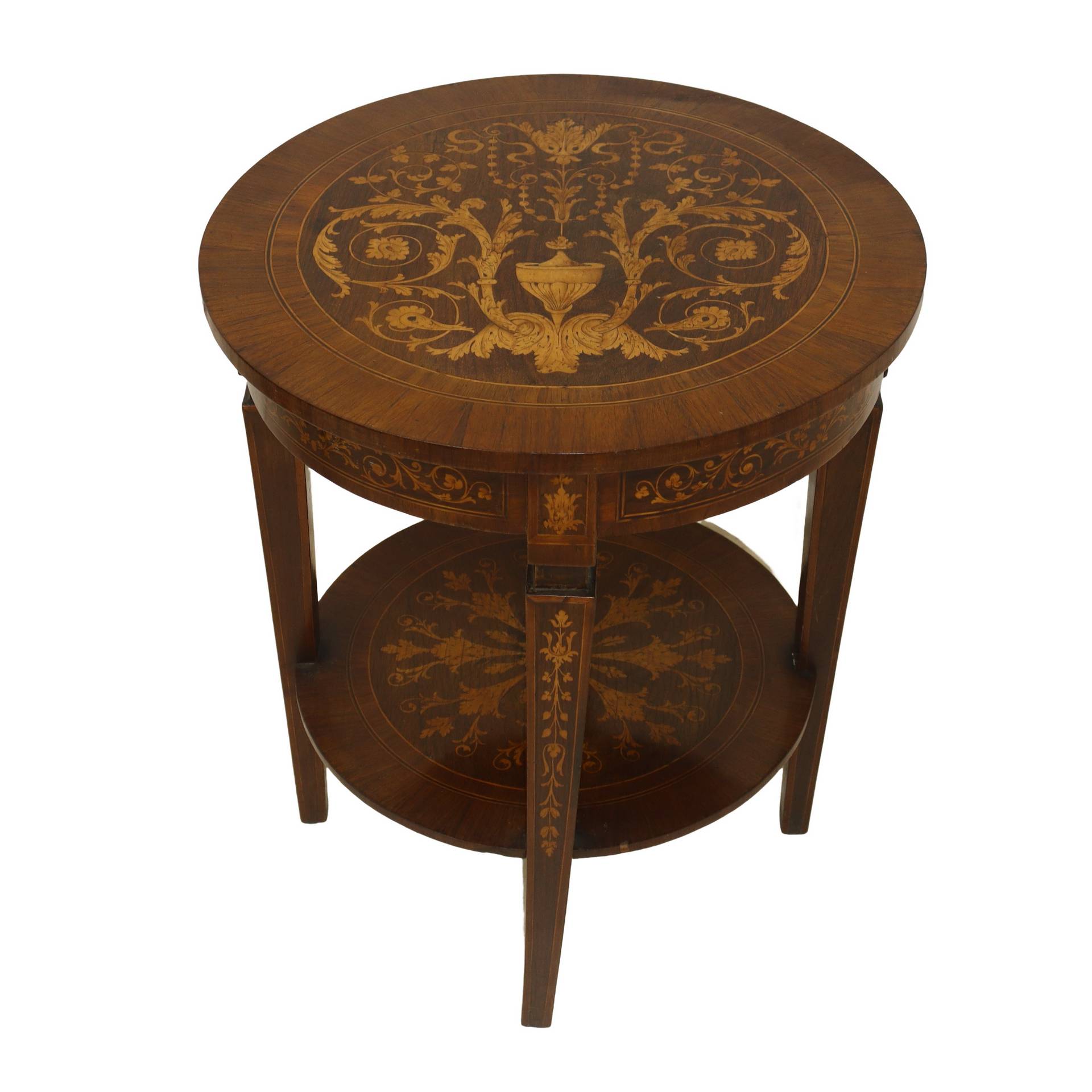 Tavolino rotondo con intarsi, piedi troncopiramidali, nineteen° secolo