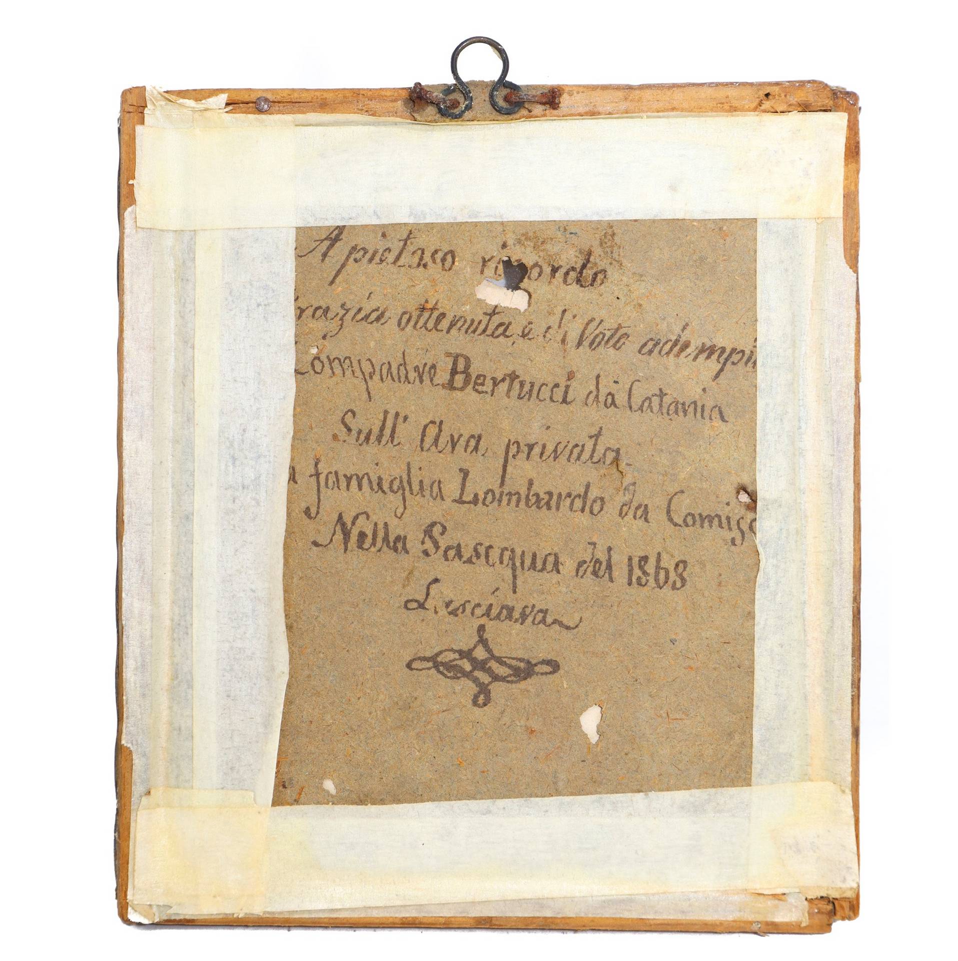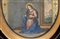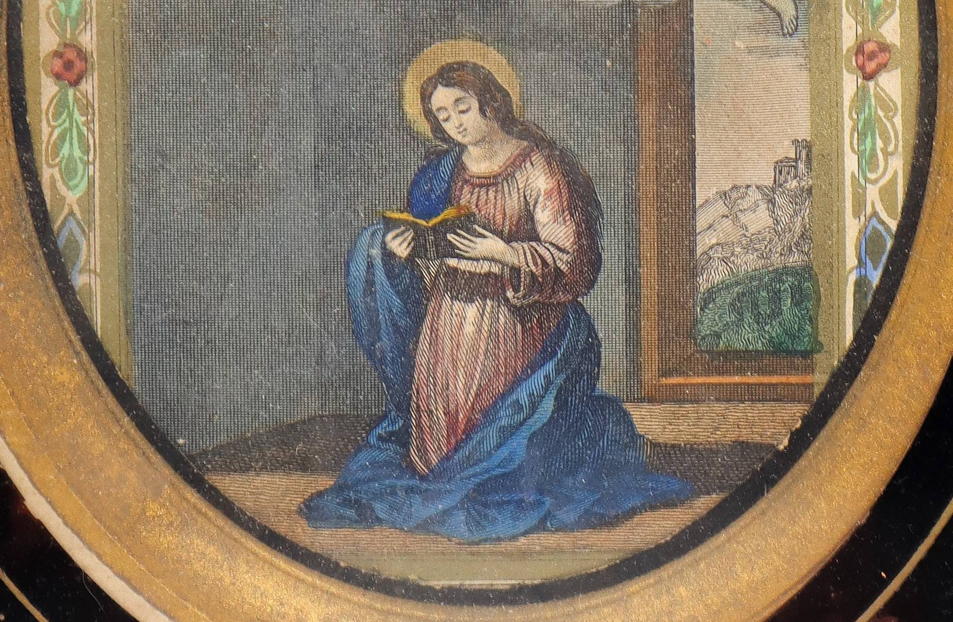 Cornice recante incisione all'acquaforte acquarellata a mano raffigutante Madonna Annunciata, 18° se