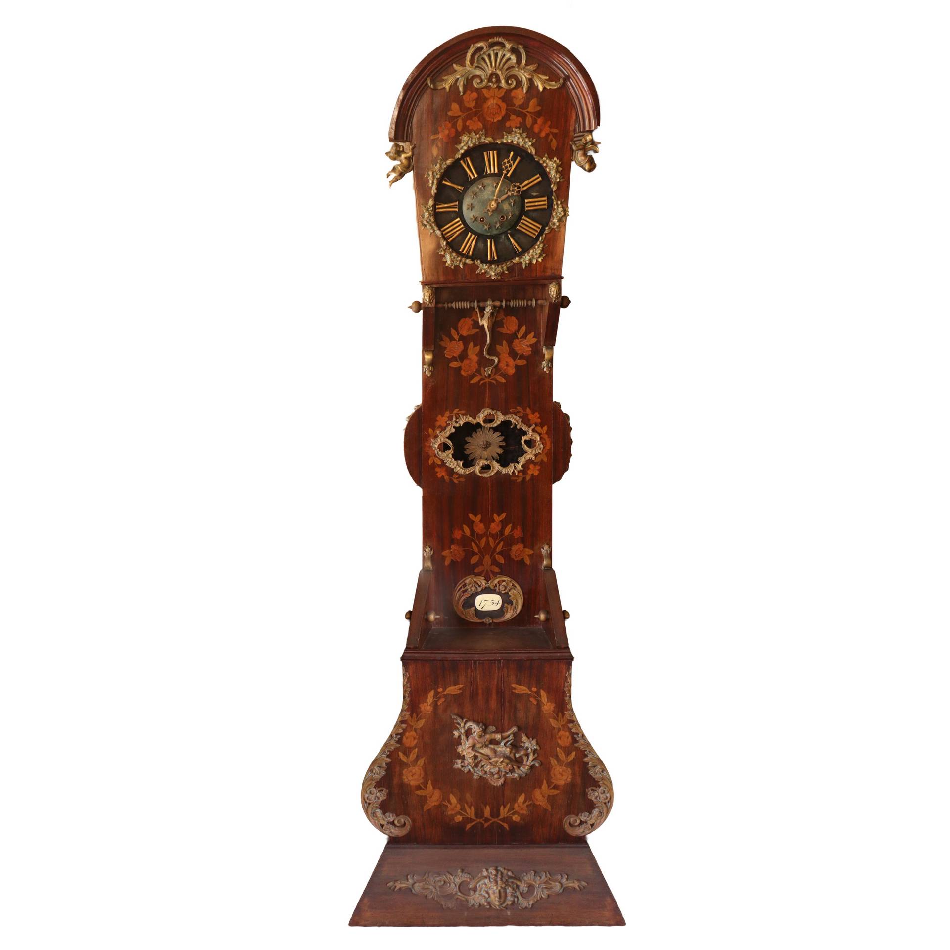 Pendola da terra a colonna, Napoleone III, nineteen° secolo H cm 220x61x39 In legno di mogano con intarsi floreali, bro