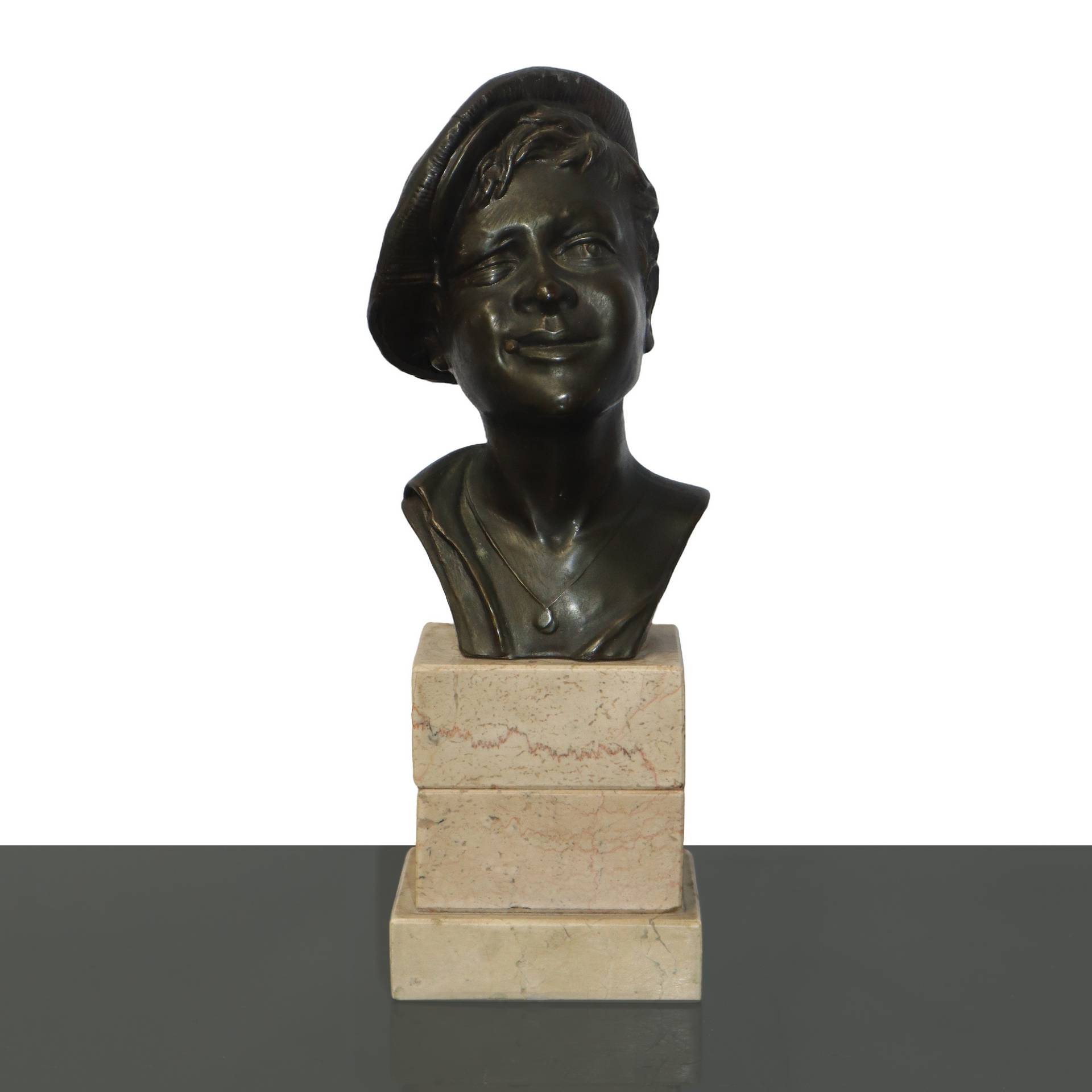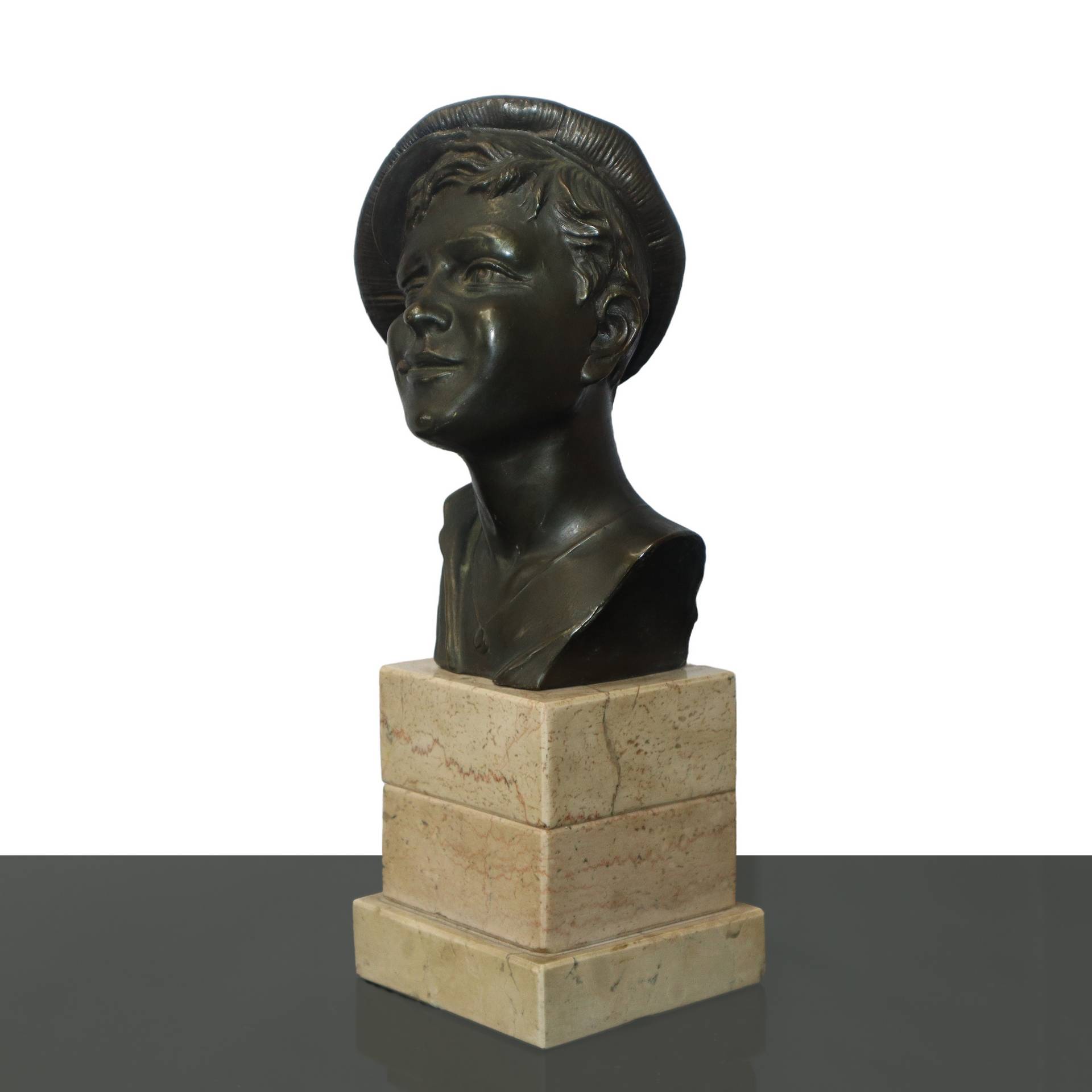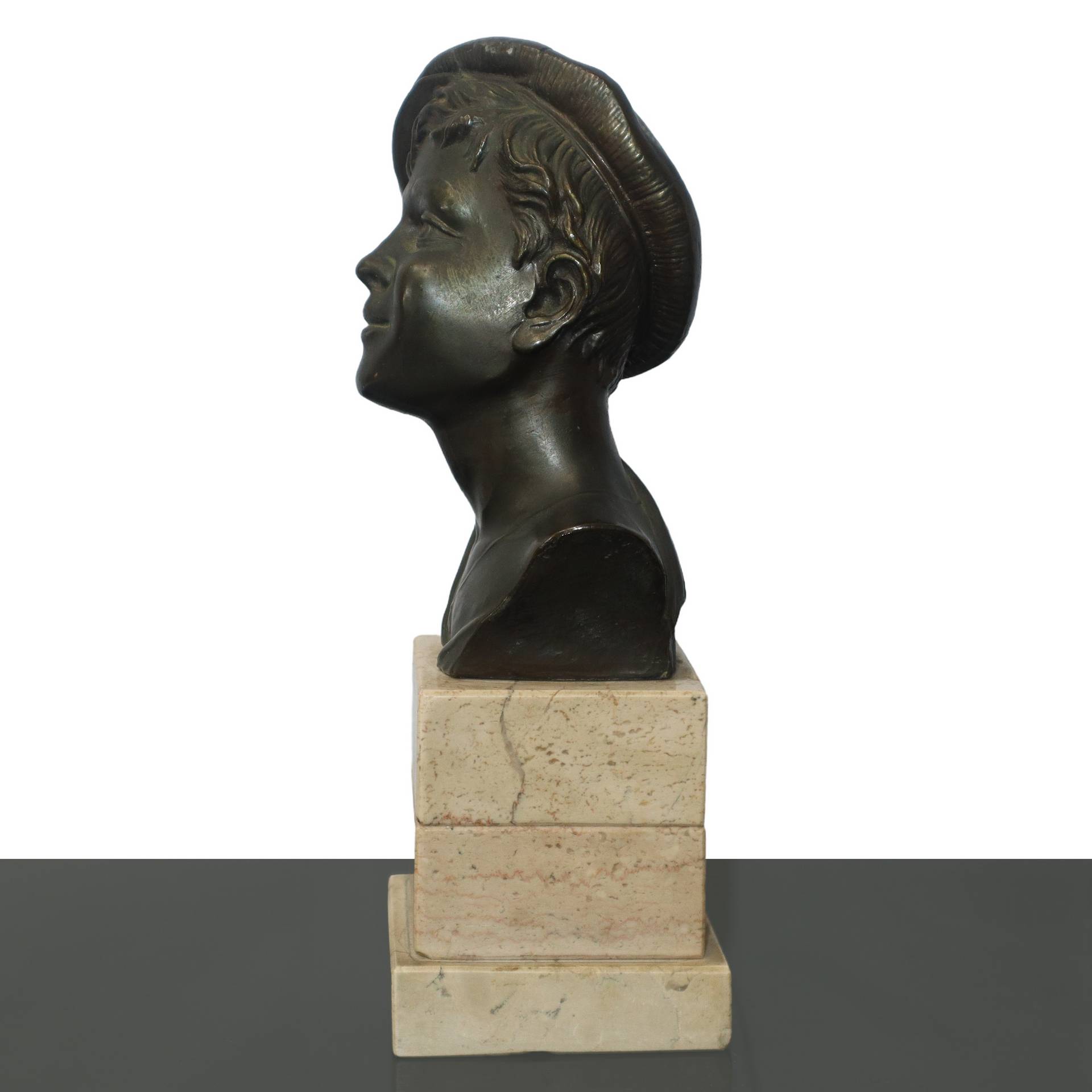 U. Jaccarino - Testa in bronzo di giovane con basco che fa l'occhiolino, 20° secolo H cm 14x8 - con base in marmo H cm