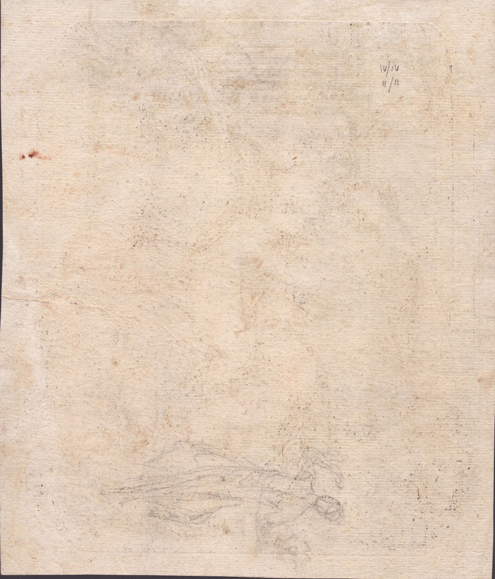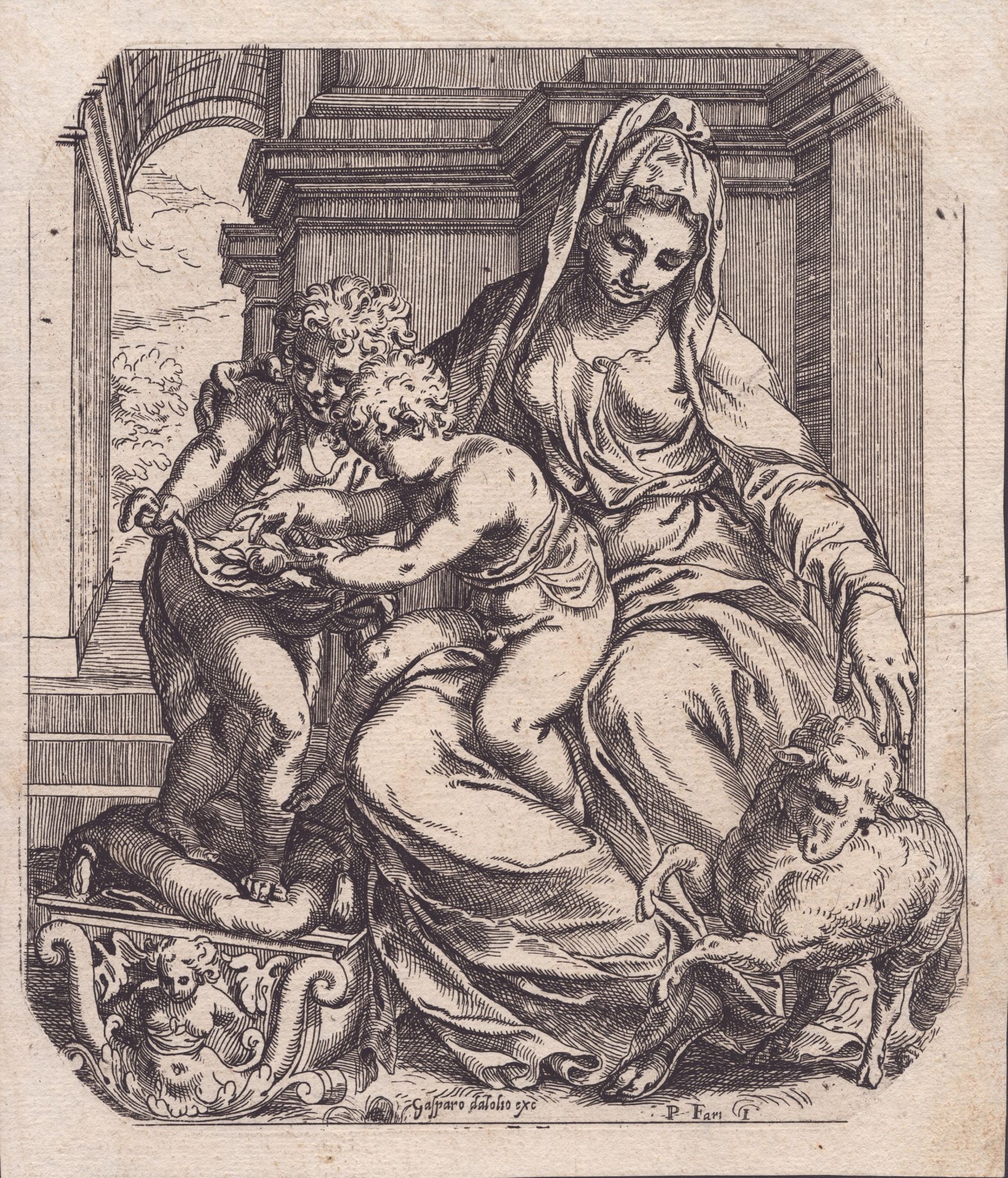 da Paolo Farinati, pubblicata da Gaspare dall'Oglio. Acquaforte, 252 x 222 mm (lastra), 275 x 235 mm (foglio). Bartsch XVI.169.3. II stato con gli angoli della lastra arrotondati. Stupenda prova, con toni di nero profondi. Stampata su carta vergata con filigrana. Foglio intonso in perfette condizioni.